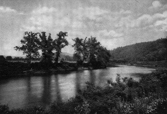 We go through the narrow Tuscarora Gap, and are journeying over the lands of the Tuscaroras, one of the Iroquois Six Nations, who came up from the South, and were given the name of Tuscarora, or the 303 "shirt-wearer," because long contact with the whites had led them to adopt that garment. Beyond the Gap, the Tuscarora Valley is enclosed on its northwest side by the Turkey Mountain, the next western ridge, and it was a region of terrible Indian conflicts and massacres in the pioneer days, when the first fort built there was burnt, and every settler either killed or carried off into captivity. Here was fought the "Grasshopper War" between the Tuscaroras and Delawares. They had villages on opposite sides of the river, and one day the children disputed about some grasshoppers. The quarrel involved first the squaws and then the men, a bloody battle following. Mifflin, an attractive town, is located here, and to the westward the Juniata breaks through the next great ridge crossing its path, passing a massive gorge formed by the Shade and Blue Mountains, flowing for miles in the deep and narrow winding canyon between them, the far-famed "Lewistown or Long Narrows," having the railway hanging upon one bank and the canal upon the other. Broken, slaty shingle covers most of the hill-slopes, and in the broad valley, above the lengthened gorge, is Lewistown, nestling at the base of a huge mountain at the outlet of the beautiful Kishicoquillas Valley, spreading up among the high hills to the northward—its name meaning "the snakes are already in their dens." The hero of this attractive region in the eighteenth century, and then its most distinguished inhabitant, 304 was Logan, the chief of the Mingoes and Cayugas, whose speeches, preserved by Thomas Jefferson, are a favorite in school declamation. He was of giant mould, nearly seven feet high, and lived at Logan's Spring in the valley. He was the friend of the white men, but when the frontier became too well settled for him longer to find the deer on which he subsisted, selling their skins to the traders, he went westward to the Ohio River, locating near Wheeling. Here, without provocation, his family were cruelly massacred, and this ended Logan's love for the whites. He became a relentless foe, wreaking indiscriminate vengeance, until killed in the Shawnee wars beyond the Ohio, having joined that hostile tribe. The Lewistown Narrows are the finest mountain pass of the Juniata, the peaks precipitously rising over a thousand feet above the river, which forces a passage between them for more than eight miles, the densely wooded cliffs so enclosing and overshadowing the gorge as to give it an appearance of deepest gloom.