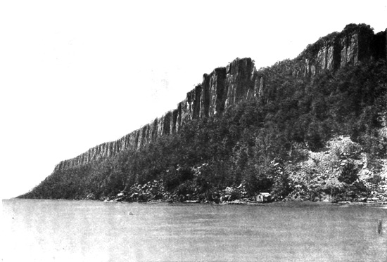 The most elevated fountain head of the Hudson is upon the northern branch. Within the inmost recesses of the mountain wilderness, in a ravine between two of the highest peaks, the river has its spring nearest the sky, known as "The Tear of the Clouds," a lofty pool, adjacent to one of the noted Adirondack portages, the Indian Pass, at about forty-three hundred feet elevation above the sea. From this pool the water flows out through the Feldspar Brook into the Opalescent River, which does not go far before it tumbles down the picturesque cascade of the Hanging Spear, leaping fifty feet into a narrow abyss between perpendicular walls, and emerging among a mass of huge boulders. All these rocks, like the greater part of the Aganus-chion, or Black Mountains, as the Indians often called the Adirondacks, are composed largely of the labradorite or opalescent feldspar, which fills the stream-bed with 237 beautiful pebbles of blue or green or gold, many of them having all the colors. Thus glittering with the splendors of its rich coloring under the sunlight, the Opalescent River falls into Sandford Lake. A visitor to the Indian Pass says the explorers entered the rocky gorge between the steep slopes of Mount McIntyre and the cliffs of Wallface Mountain to the westward. Clambering high above the bottom of the canyon, they could see the famous Indian Pass between these mountains in all its wild grandeur. Before them rose a perpendicular cliff nearly twelve hundred feet from base to summit, its face being apparently as raw as if only just cleft. Above sloped Mount McIntyre, still more lofty than the cliff of Wallface, and in the gorge between lay piles of rocks, grand in dimensions and awful in aspect, as if hurled there by some terrible convulsion. Through these came the little stream going to the Hudson, bubbling along from its source close by a fountain of the Ausable. In spring freshets their waters commingle, part finding their way to the ocean at New York and part at Newfoundland.
