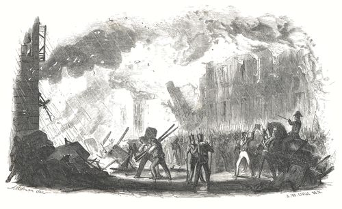 The troops under Jackson heard the din of the (p. 38) conflict within, and clamored loudly to be led to the assault. He, however, held them back, and stood and listened. Discovering, at length, by the incessant firing in a single place, that the Americans were making no progress, he ordered the drums to beat the charge. A loud and thrilling shout rolled along the American line, and, with levelled bayonets, the excited ranks precipitated themselves on the breastwork. A withering fire received them, the rifle-balls sweeping like a sudden gust of sleet, in their very faces. Not an Indian flinched, and many were pierced through the port-holes; while, in several instances, the enemy's bullets were welded to the American bayonets. The swarthy warriors looked grimly through the openings, as though impervious to death. This, however, was of short duration, and soon the breastwork was black with men, as they streamed up the sides. Major Montgomery was the first who planted his foot on the top, but he had scarcely waved his sword in triumph above his head, when he fell back upon his companions, dead. A cry of vengeance swelled up from his followers, and the next moment the troops rolled like a sudden inundation over the barrier. It then became a hand-to-hand fight. The Indians refused to yield, and with gleaming knives and tomahawks, and clubbed rifles and muskets, closed in a death grapple with their foes. Civilization gave the bold frontiersmen (p. 39) no advantage here—it was a personal struggle with his swarthy rival for the mastery, where they both claimed the right of possession. The wild yell of the savage blended in with the stem curse of the Anglo-Saxon, while high and shrill over the clangor and clash of arms, arose the shouts of the prophets, as dancing frantically around their blazing dwellings, they continued their strange incantations, still crying victory.