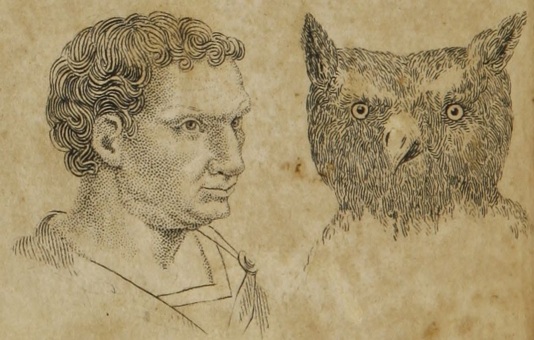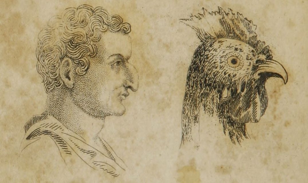 This eye, and round nose with a great eminence like the bill of a cock, are incontestible proofs that the owner, like that spirited little animal, is vigilant, brave, and voluptuous.{129}{128}