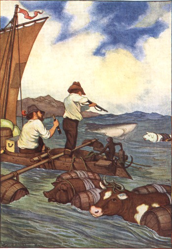 "Will you praise me too?" said my dear wife. "I have nothing to show, but I can give you good news. Some useful animals are still alive; a cow, a donkey, two goats, six sheep, a ram, and a fine sow. I was but just in time to save their lives by taking food to them."