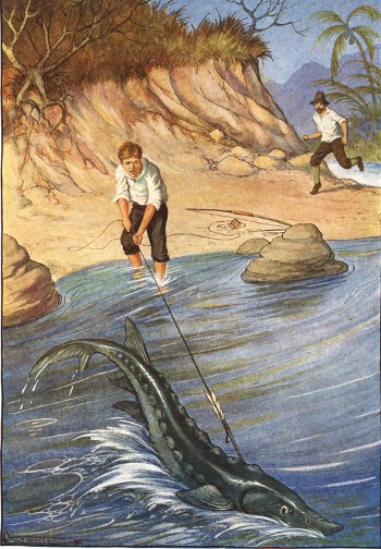 We stopped, speechless. Was it fancy? Had we really heard guns from a strange ship? Or had the boys again fired? No! there were the lads leaping into their canoe and paddling in hot haste toward us. They, too, had heard the sound.