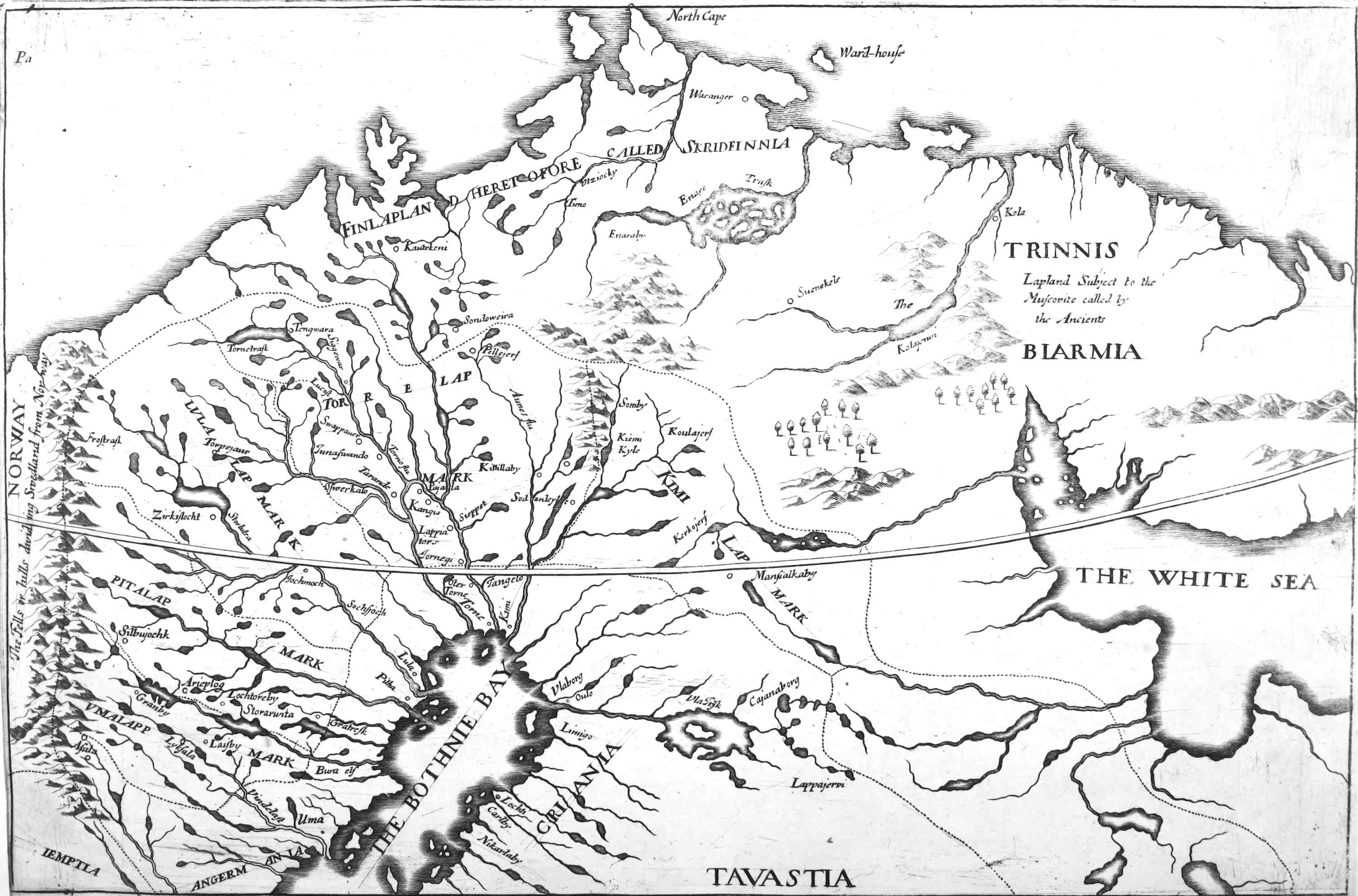 There is also a 3d Division of Lapland, that respects the several Princes to whom the Country is in subjection. And this Andr. Buræus intends, when he tells us, The greatest part of Lapland, viz. the Southern and inland Country, belongs all to the Kingdom of Sweden: The maritime tract, that lies on the Ocean, and is called Findmark (whose Inhabitants the Siœfinni, or maritime Findlanders, are so named from their living by fishing) to Norway: The rest of them that dwell from the Castle of Warhuus to the mouth of the white Sea, are subject to the Russians, which part the Swedes call Trennes, the Natives Pyhinienni, and the Russians Tarchana voloch. Of their subjection to these severall Princes, we shall speak when we come to treat of their Government; and also of those parts that belong to Norway or Denmark, and Russia. At present we shall only mention the division of that part which is under the Swedes, and is named by Buræus, the Southern and inland Lapland, and by Petr. Claud. Lappmarkia properly so called. This is divided into six lesser parts called marker, or lands, tho Buræus chuses to render them Territories or Provinces. Each of these have their distinct names, and are called Aongermandlandslapmark, Umalappmark, Pithalappmark, Lulalapmark, Tornalapmark, Kiemilapmark. So Samuel Rheen in his first Chapter, That part of Lapland which belongs to Sweden is divided into the Kiemensian, Tornensian, Lulensian, Pithensian, Umensian, and Angermanlandensian Lapmark. Buræus mentions but five of these[11] Provinces, viz. Umalappmark, Pithalappmark, Lulalapmark, Tornelapmark, and Kimilapmark, comprehending Angermandlandslapmark under Umalapmark, not that they are one and the same Province, but because they are both governed by one Lieutenant. Each of these Provinces take their name from Rivers that run thro the midst of them, as Wexionius in his description of Swedland assures us. As for their situation, Angermanlandslapmark borders upon Andermannia and Jemtia, to this joins Umalapmark, next to that is Pithalapmark, and then Lulelapmark, all of them lying Westward, reaching on one side to that ridg of Hills that divides Swedland from Norway, and on the other side to the Western Bothnia. Northward of them lies Tornelapmark, and extends it self from the fartheh corner of the Bay of Bothnia all along the North Sea, called by Seamen Cape Noort. Next to this lies Kimilapmark, winding from the North toward the East, and bounded on one side by the Eastern Bothnia, on another side by that part of Lapland that belongs to Russia, and on a third side by Cajania and Carelia.