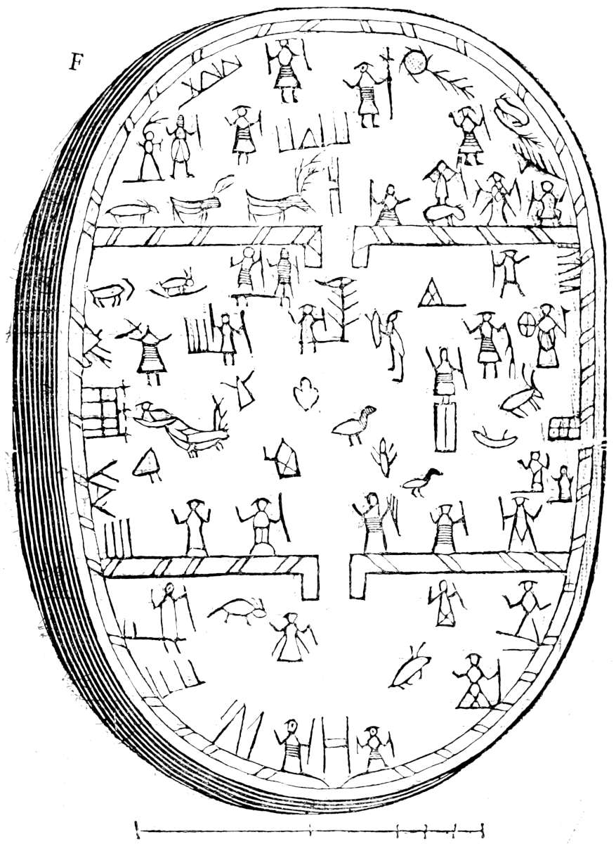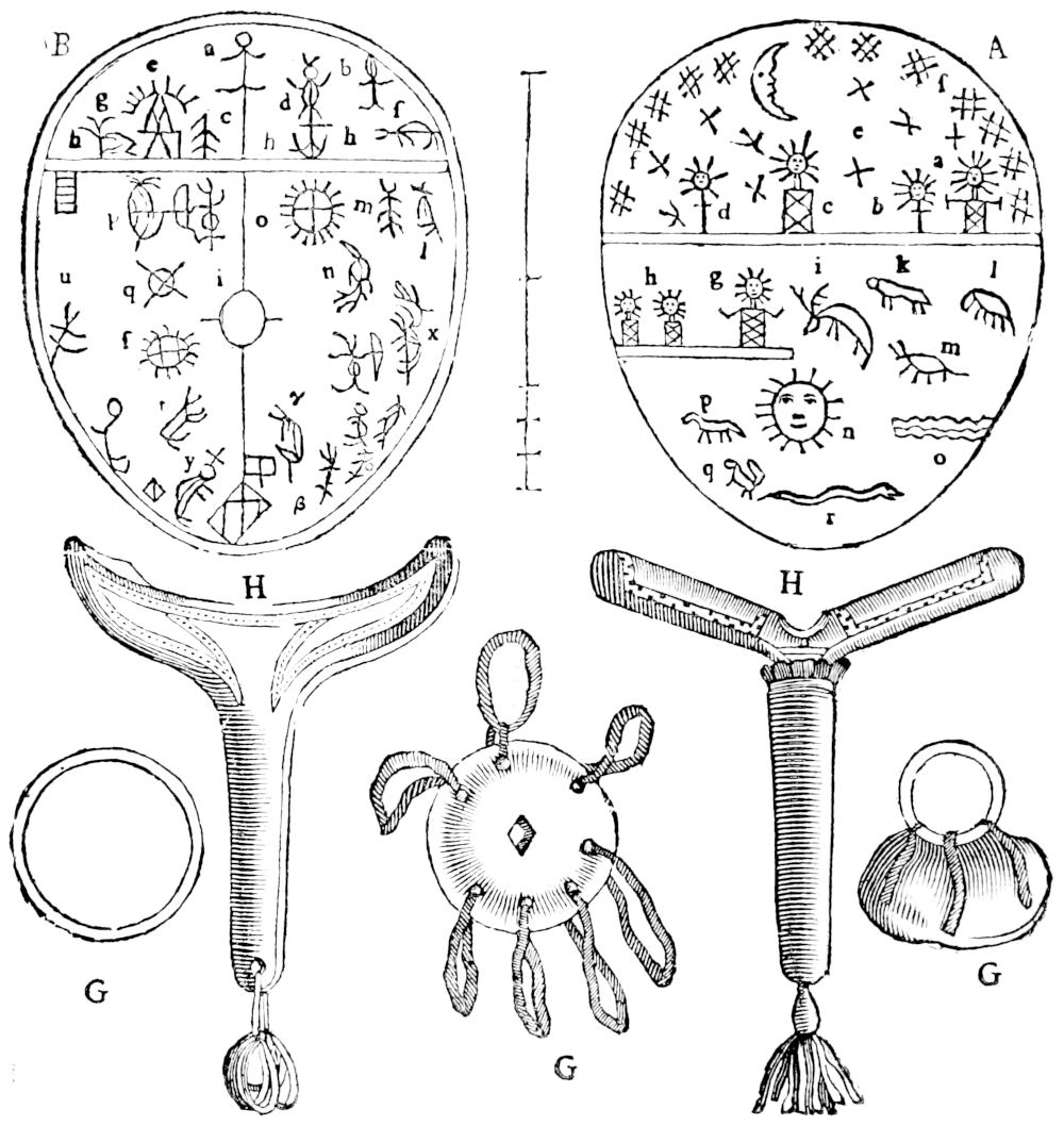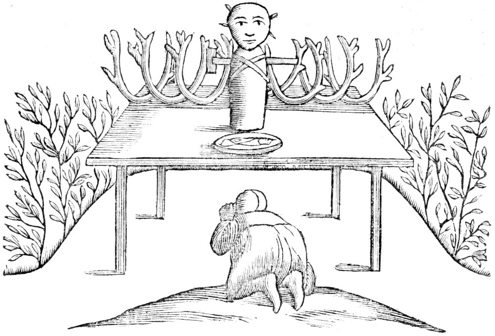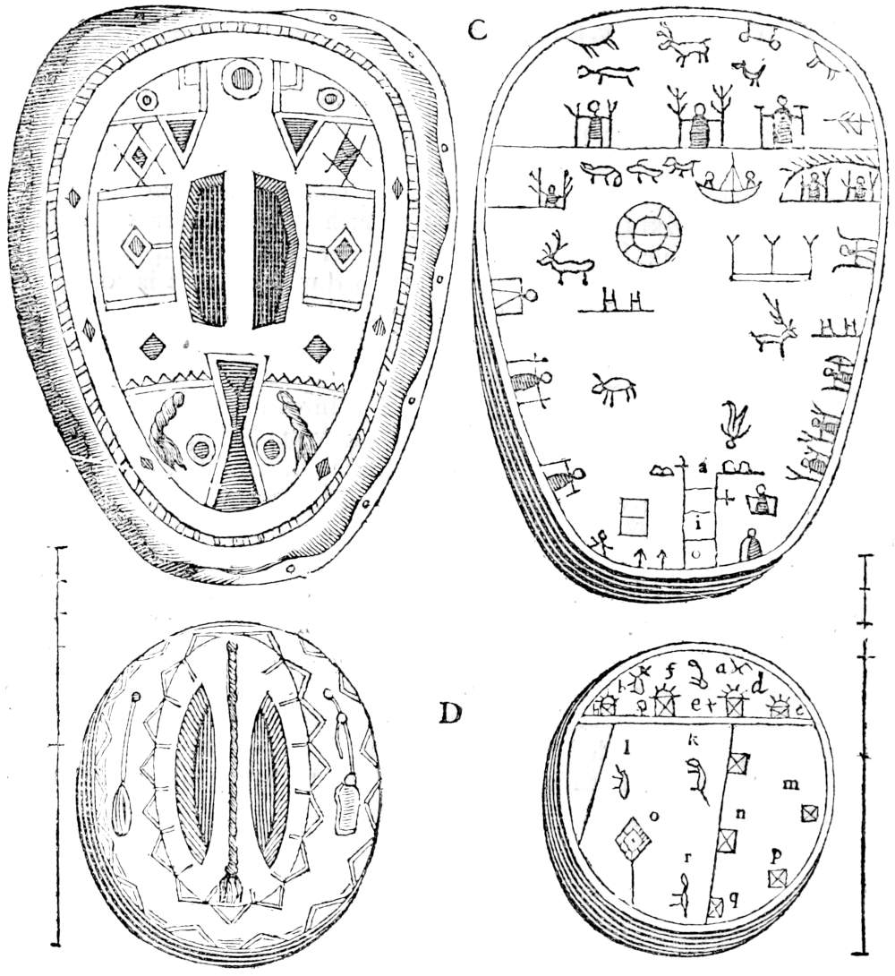 Next we must consider what kind of worship they pai’d their Gods, which we have already mentioned; but of this also we are in great uncertainty, unless we make our judgment from the present times, and deliver those rites which are now used by the Laplanders in their religious performances, but of this we shall speak more when we come to treat of the present state of their Religion. We shall only note here what is read of Jumala. He was[23] heretofore represented in the image of a man sitting upon an Altar, with a Crown on his head, adorned with twelve gems, and a golden Chain about his neck, which was formerly of the value of 300 Marks; tho whether the word in the History doth signify a chain, or may better be rendred a Jewel, ’tis uncertain; for it is said that Charles lifting his Ax, cut the collar whereon it hanged: which shews that it was rather gold, artificially carved and set with jewels, which was (I suppose) the reason why Herrodus doth not set down its weight, as is usual in the valuing of chains, but its price. This Jewel called Men from Mene the Moon whose figure it represented, was, as I imagine, tied to a collar about the neck, and hanged down upon the brest of the image, as is usual in all such ornaments at this day. But whether this were a chain or locket, it is certain the other parts of his habit were agreeable to our description of him; wherein he was not much unlike the Swedes God Thor, as he is described in our History of Upsal: for he also was made sitting with a Crown on his head, adorned with stars, as Jumala with jewels, each to the number of twelve, from whence I am almost perswaded that the Biarmi, and after them the Laplanders, either worshipped one God under two names, or if they were two Gods, they used their names promiscuously. For the true God, whom they knew partly by reason, and partly by tradition, was by them called Jumala: but after the name of Thor began to be famous, they either called Jumala by the name of Thor, or gave Thor the name of Jumala: which I gather from hence, because at this day the Laplanders attribute that to their Thor, which questionless formerly they did to Jumala, viz. the power and command over the inferior Gods, especially the bad and hurtful: also over the air, thunder, lightning, health, life and death of men, and such like; as shall be shewn hereafter. What his image was made of, is not known, but I suppose it was wood, because Charles is said to have cut off his head with his Ax, when he only designed the cutting of the collar that held the aforesaid jewel, which he could hardly have don, had it bin either silver or gold. Besides, to prove it was wood, it was burnt to ashes, together with the Temple, and all its furniture, excepting some gold, and other precious things; with which gold particularly they did homage to their God: for the Biarmi in their ceremonies to Jumala, did cast gold as a sacred offertory to him into a golden dish, of a vast weight and bigness, which stood upon his knees. This Vessel, in the History of Olaus, is said to be of silver, and full of silver coin, for a little before his time both basin and gold were lost, and the Biarmi, never had an opportunity of getting more. They did not worship Jumala every where, but in some few places, or perhaps only in that one, where in a thick remote wood he had a kind of a Temple, not as they are usually built with walls and roof, but only a piece of ground fenced as the old Roman Temples were; from hence one might look every way, which could not have bin don had they bin cover’d at the top. As in the form of their Temples, so in the situation of them they did imitate the ancients, who for the most part chose groves to worship their Gods in, and there built their Temples. So much of Jumala, and the ancient manner of worshipping him amongst the Biarmi, as it is transmitted to us by ancient Writers; but of Thor, the Sun, and the other Gods, there is nothing read but what belongs to the times of Christianity, and the superstition still remaining amongst them, of which we shall speak particularly in the following Chapter.