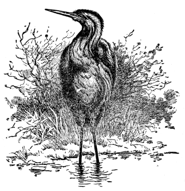 William. "While I was looking at him a heron came flying over my head, with his large flapping wings. He lit at the next turn of the river, and I crept softly behind the bank to watch his motions. He had waded into the water as far as his long [15] legs would carry him, and was standing with his neck drawn in, looking intently on the stream. Presently he darted his long bill as quick as lightning into the water, and drew out a fish, which he swallowed. I saw him catch another in the same manner. He then took alarm at some noise I made, and flew away slowly to a wood at some distance, where he alighted."