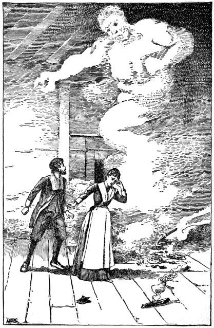 They were very loth to do this; but at last, their need being great, they did so. They were [45] relieved to find that the taking of his blood did not seem to hurt the good, kind giant, and then they put the pot on the fire, and waited to see what would happen. After a time, they heard a singing noise, and they began to be frightened. At last out of the pot there came a cloudy vapor, which rose higher and higher and higher, until it went away. But they saw no giant.