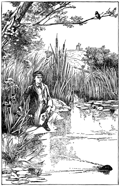 William. "From the hill I went straight down to the meadows below, and walked on the side of a brook that runs into the river. It was all bordered with reeds and flags and tall flowering plants, quite different from those I had seen on the heath. As I was getting down the bank to reach one of them, I heard something plunge into the water near me. It was a large water-rat, and I saw it swim over to the other side, and go into its hole. There were a great many large dragon-flies all about the stream. I caught one of the finest, and have him here in a leaf. But how I longed to catch a bird that I saw hovering over the water, and every now and then darting down into it! It was all over a mixture of the most beautiful green and blue, with some orange color. It was somewhat less than a thrush, and had a large head and bill, and a short tail."