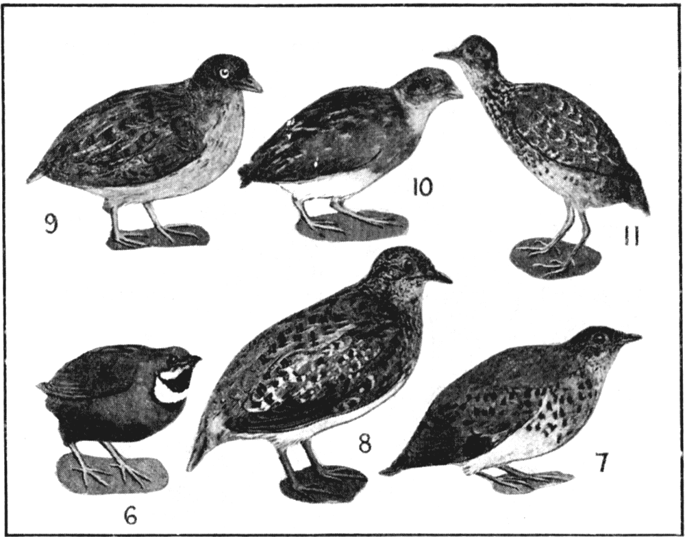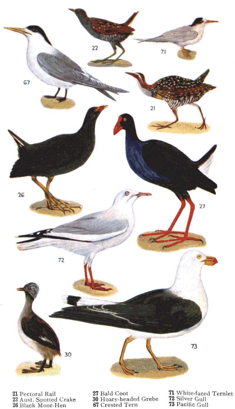 =vt. Eur. Water-Rail. See also the explanatory notes in the PREFACE, and in the PREFACE TO THE SECOND EDITION. "The number at the right side of the page is the length of the bird in inches (from the tip of bill to the tip of tail)." ... so: 1 2* Mallee-Fowl, Lowan, Native Pheasant, Pheasant (e), Leipoa ocellata, N.S.W., V., S.A., W.A. Stat. r. mallee scrubs 24 Like a small turkey; neck light fawn-gray; back, wings spotted