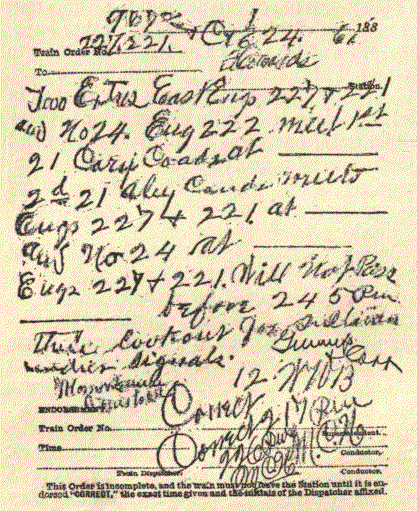With his first experiments in train dispatching the writer became convinced that the method of issuing train orders in the same words to all concerned in each transaction afforded greater security than that supplied by any other form of order. Another early conviction was that each step in the process of preparing and issuing train orders should be carefully and minutely arranged for by specific rules.