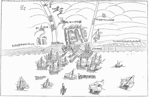 As far as I have read, Brighthelmstone had peace until 1514, when Holinshed tells us: 'About the same time, the warres yet continuing betweene England and France, Prior Jehan (of whom ye have heard before in the fourth yeere of this King's reigne), a great capteine of the French navie, with his gallies and foists[12] charged[Pg 7] with great basilisks[13] and other artillerie, came on the borders of Sussex, in the night season, at a poore village there, called Brighthelmston, and burnt it, taking such goods as he found. But, when the people began to gather, by firing the becons, Prior Jehan sounded his trumpet, to call his men aboord, and by that time it was daie. Then certeine archers that kept the watch, folowed Prior Jehan to the sea, and shot so fast, that they beat the gallie men from the shore; and wounded manie in the foist; to the which Prior Jehan was constreined to wade, and was shot in the face with an arrow, so that he lost one of his eies, and was like to have died of the hurt; and, therefore, he offered his image of wax before our ladie at Bullongne, with the English arrow in the face for a miracle.'