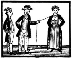 (p. 350) "The ship launch to which the delinquent belongs is hoisted out, and rigged up for the bloody tragedy. In this boat are two boatswain's mates, with their cats, together with the surgeon and master-at-arms. The poor creature is now taken out of irons, in which he has been confined both before and after his sentence, and brought down from the deck into the boat. The master-at-arms next desires the mates to tie him up; he is then stripped, and a blanket thrown over his shoulders. The boats of each ship then make their painters fast, one ahead of the other, and thus form a long line of boats. The captain now looks over the gangway, the master-at-arms reads the infernal sentence, and the quantity of lashes the victim is to receive at each ship. The captain calls the boatswain's mate, and says, 'Go on, sir, and do your duty.'