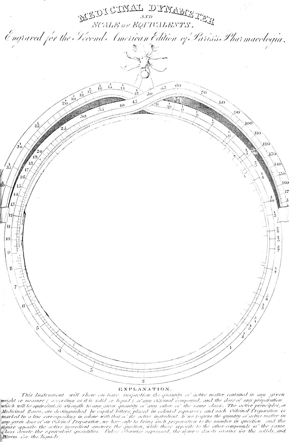 This Instrument will shew on bare inspection, the quantity of active matter contained in any given weight or measure (according as it is solid or liquid) of any Officinal compound, and the dose of any preparation which will be equivalent in strength to any given quantity of any other of the same class. The active principles, or Medicinal Bases, are distinguished by capital letters, placed in coloured squares; and each Officinal Preparation is marked by a line corresponding in colour with that of its active ingredient. If we require the quantity of active matter in any given dose of an Officinal Preparation, we have only to bring such preparation to the number in question and the figure opposite the active ingredient answers the question, while those opposite to the other compounds of the same class denote the equivalent quantities. Unless otherwise expressed, the figures denote Grains for the solids, and Minim for the liquids.