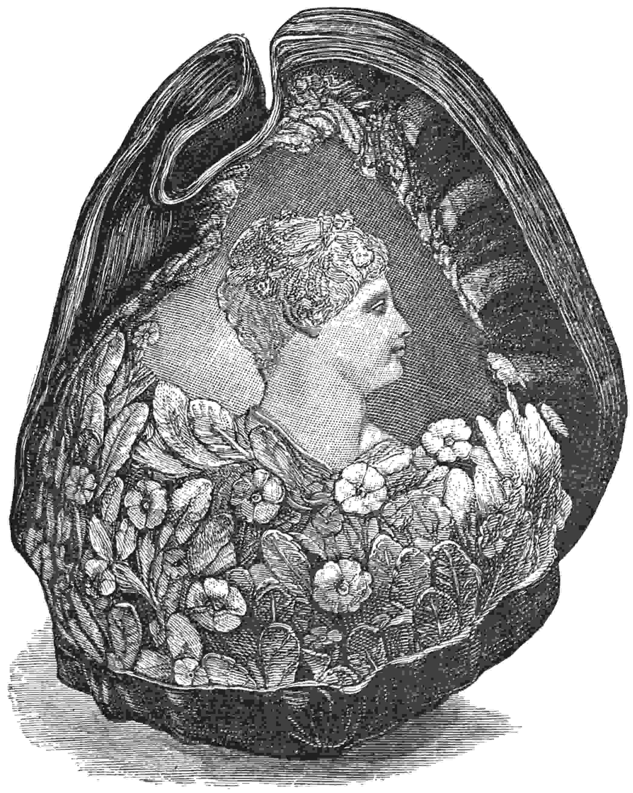 The use of this shell for the purpose of Cameo-cutting was first practised in Italy, about the year 1820, and it was then believed to be of Sicilian origin. For many years all the shells used were exported from England, and the number averaged about three hundred per annum; these were valued at 30s. each. They soon became a favourite medium in Rome with the workmen, and the art was taken thence to Paris, where it flourished. In 1847 the sale of shells was reported to have reached 100,500, and their declared value was £8900, while the Cameos which were produced were estimated to be worth at least £40,000.