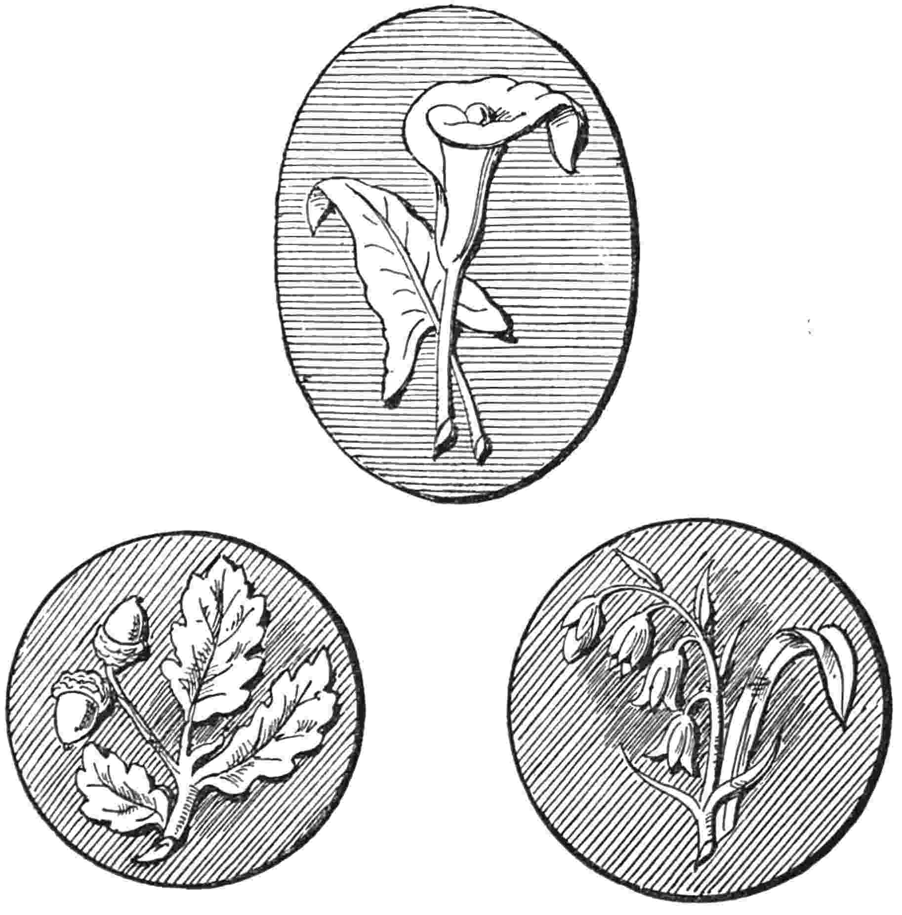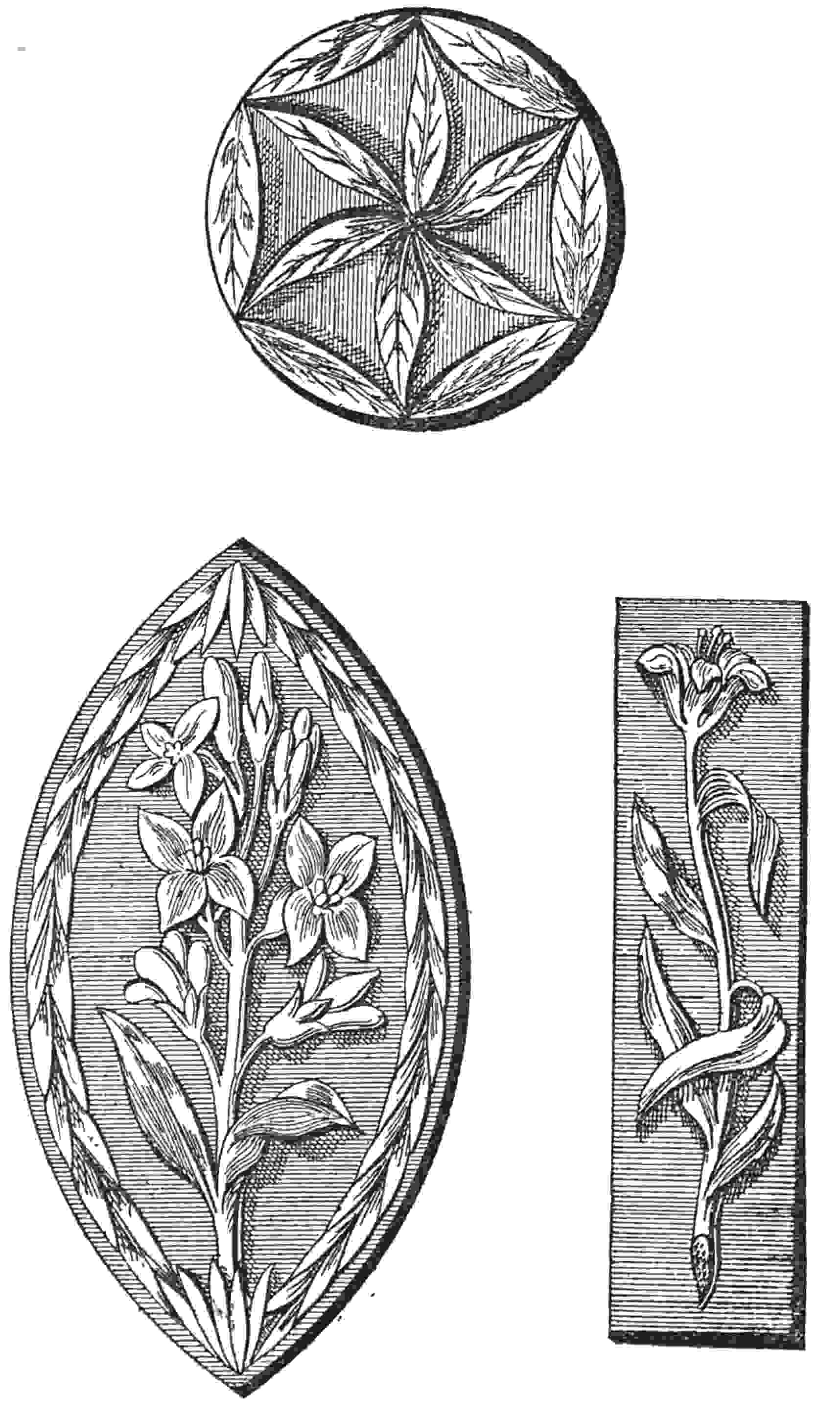 “Another range in which the art would flourish is church decoration, for which Cameos are peculiarly appropriate. There is a purity and, at the same time, a durability about them, which commends their use in this direction. How beautiful, for instance, a frieze of palm-leaves would look51 upon a reredos, or a carved lily upon a memorial stone, or how appropriately a pulpit might be decorated in Cameo! As I write, ideas for church adornment crowed into my mind, but as I have not yet exhausted the resources of Cameo-cutting in another direction, I must leave my readers to imagine these for themselves.”