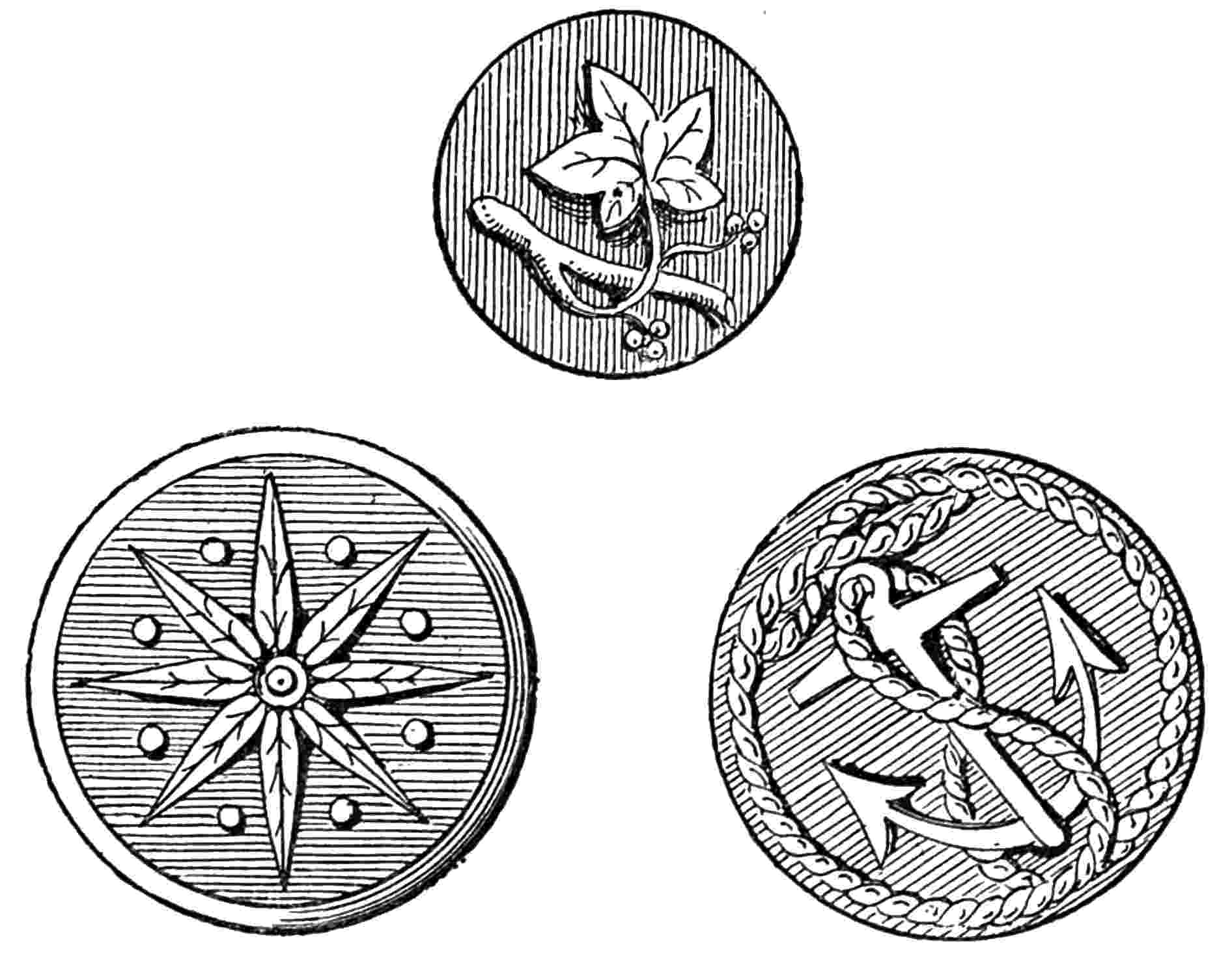 Fashion is ever introducing new adaptations of ornament to dress. Note the two or three buttons with which a lady’s loose jacket is now fastened on the left. Why not carve these in Cameo, a dainty design in white on a purple or red or brown background, glowing like a precious stone? These would look beautiful!