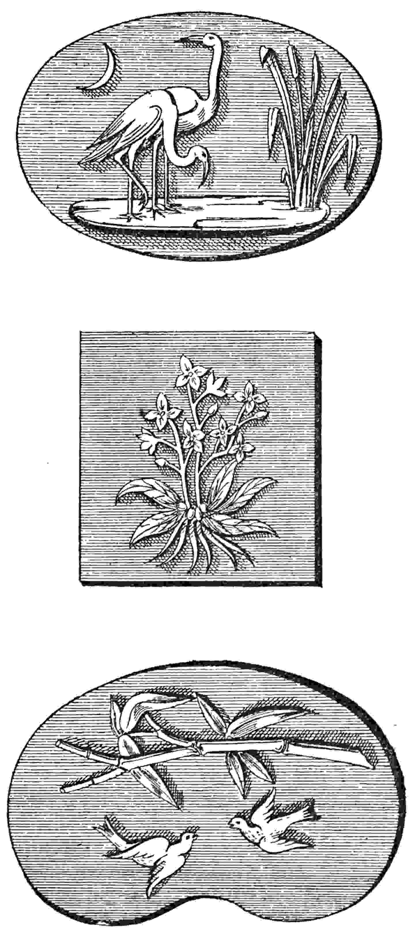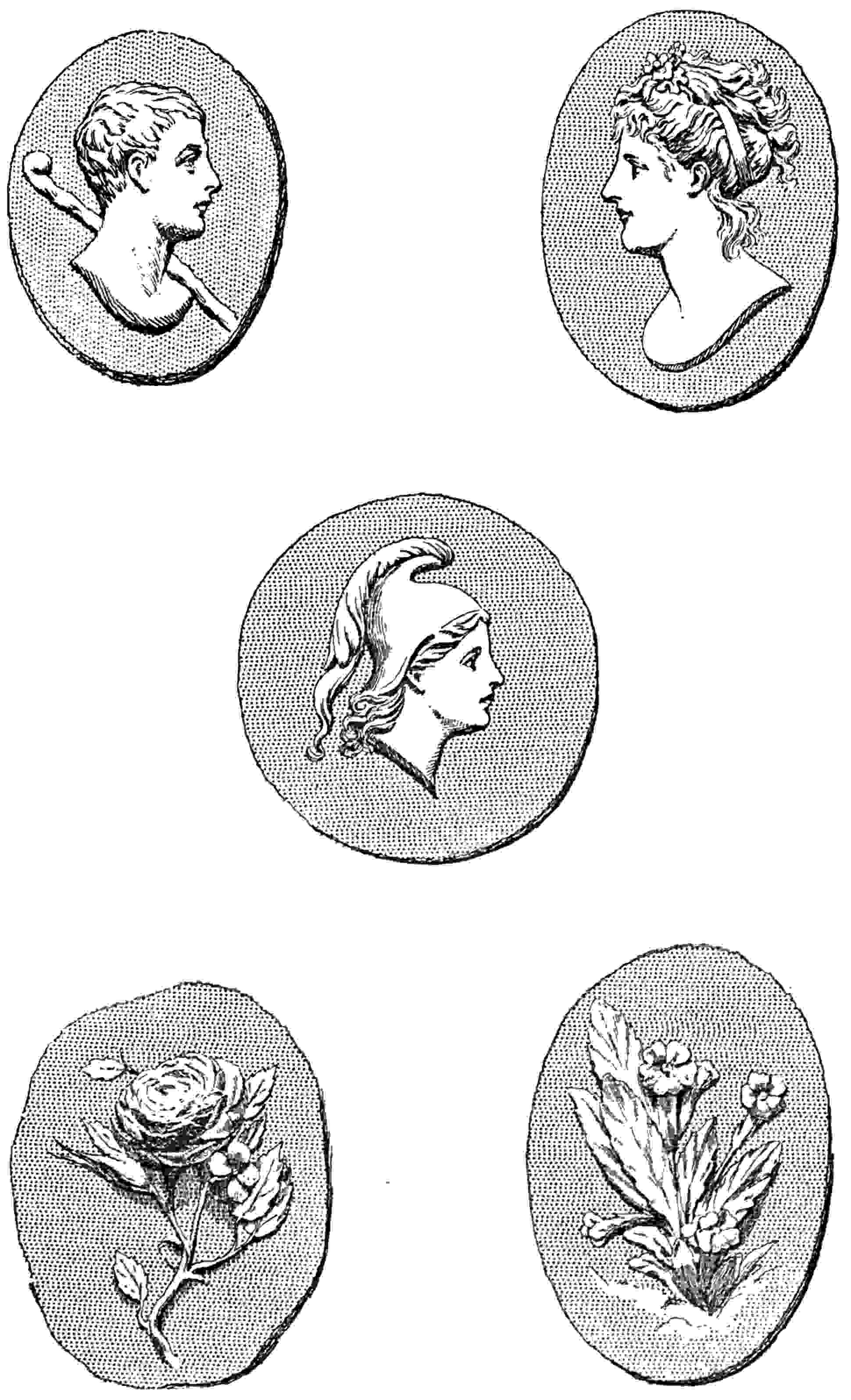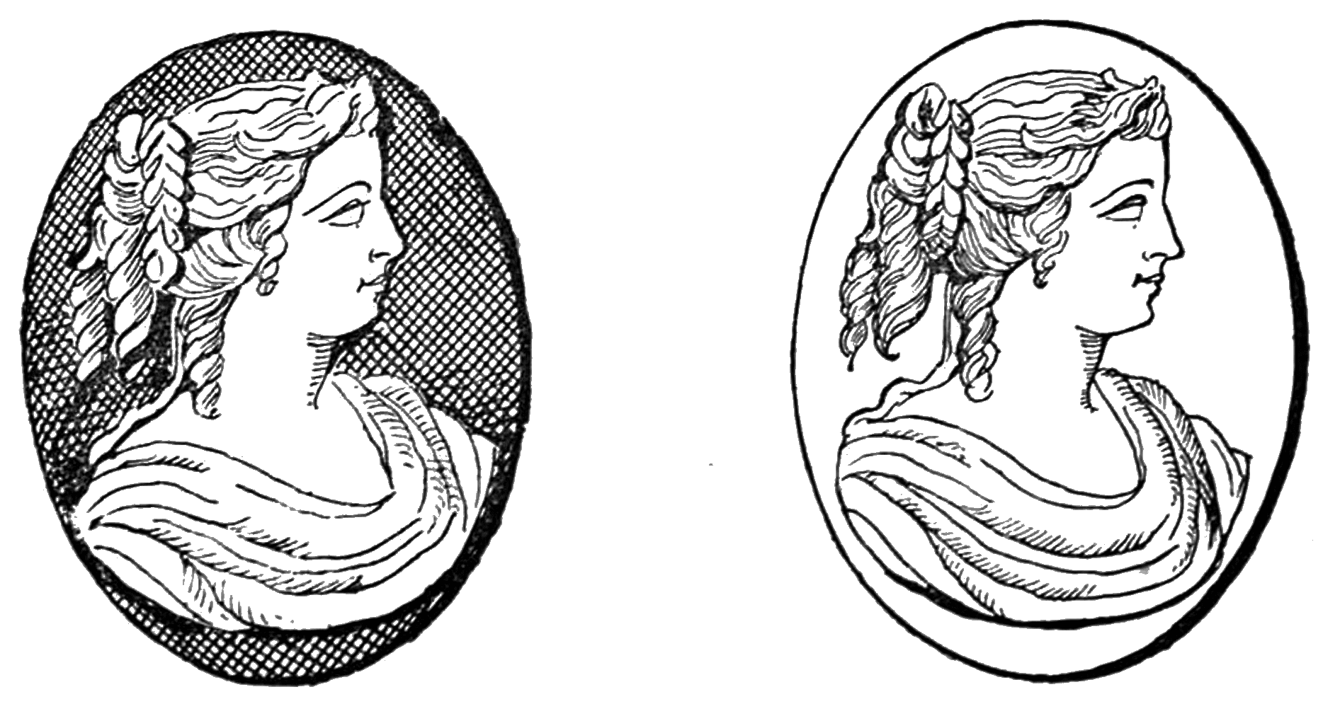 “The term Cameo, in the language of art, is usually applied to gems or stones that are worked in relievo, that is, in which the object represented is raised above the plane of the ground, in contradistinction to intaglio, in which the subject is53 engraved or indented. The art of ornamenting precious stones with heads and figures is of high antiquity, but it was for the most part confined to intaglio or indenting, an easier process than relieving the work from a ground. Such stones were used for signets or seals in very remote ages by the Etruscans and the Greeks. One of the first names of great note that occurs in this branch of art is that of Pyrgoteles, who lived in the time of Alexander the Great, and who alone was permitted to engrave seal rings for the King. Tryphon, who lived under the immediate successors of Alexander, also deserves mention here, being the author of a beautiful and well-known Cameo in the Marlborough collection, representing the marriage of Cupid and Psyche.