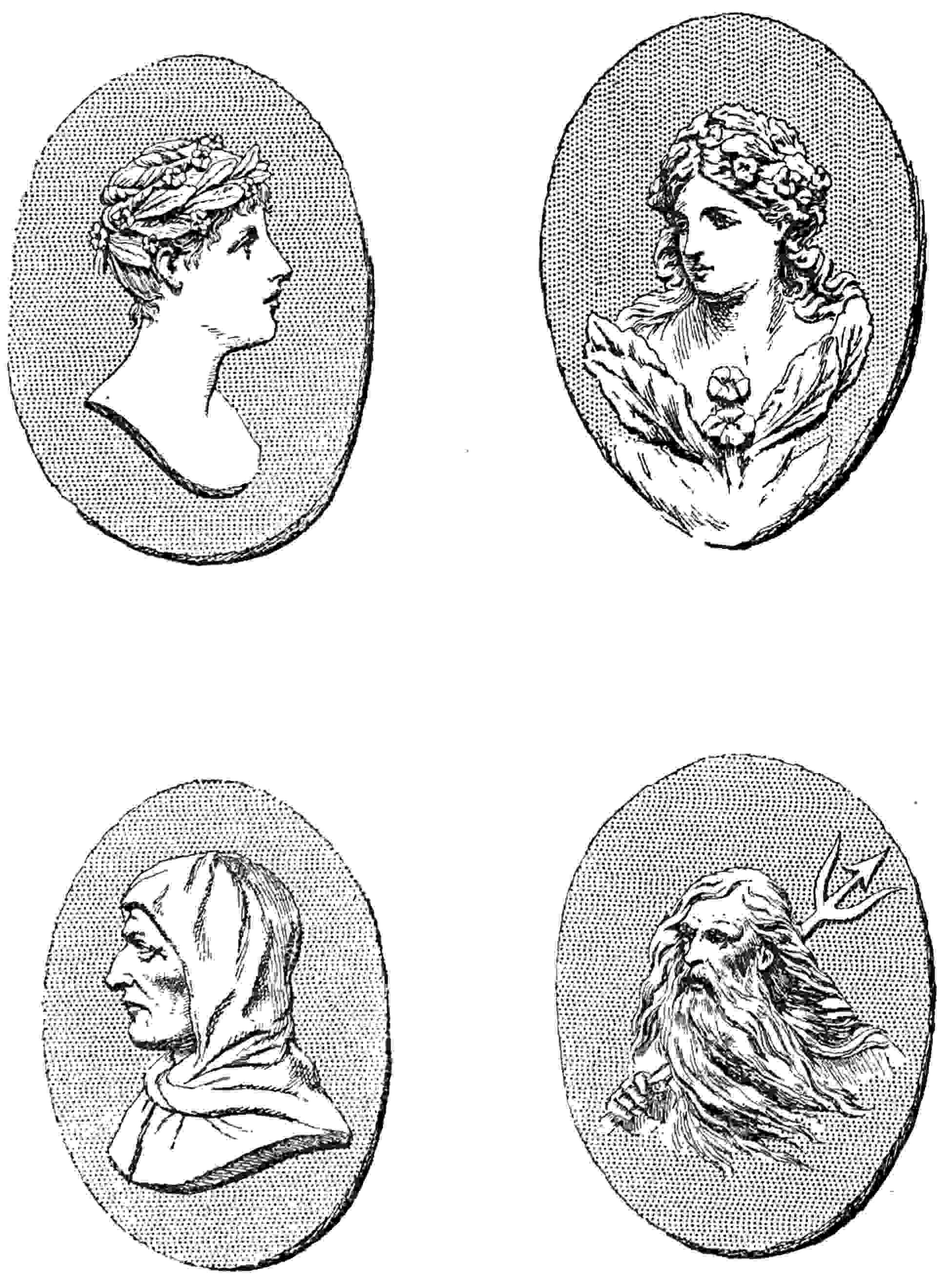 “The meaning of the word Cameo,” says a writer in the Housewife, “is literally a picture of52 one colour. In an ancient dictionary of arts and sciences, more than a hundred years old, which I have before me, the word is thus spelt and explained:—‘Camaieu or Camehuia, in Natural History, the same with camæa.’ I look up ‘camæa,’ and find the word descanted upon as follows:—‘In Natural History, a genus of the semi-pellucid gems, approaching to the onyx structure, being composed of zones, and formed on a crystalline basis; but having their zones very broad and thick, and laid alternately on one another, with no common matter between; usually less transparent and more debased with earth than the onyxes.’ Species are then described which I need not detail. Returning next to the camaieu, I find:—‘This word is also used to express a stone, on which are found various figures and representations of “landskips,” &c., formed by a kind of lusus naturæ, so as to exhibit pictures without painting. It is likewise applied to any kind of gem on which figures are engraven, either indentedly or in relievo.’”
