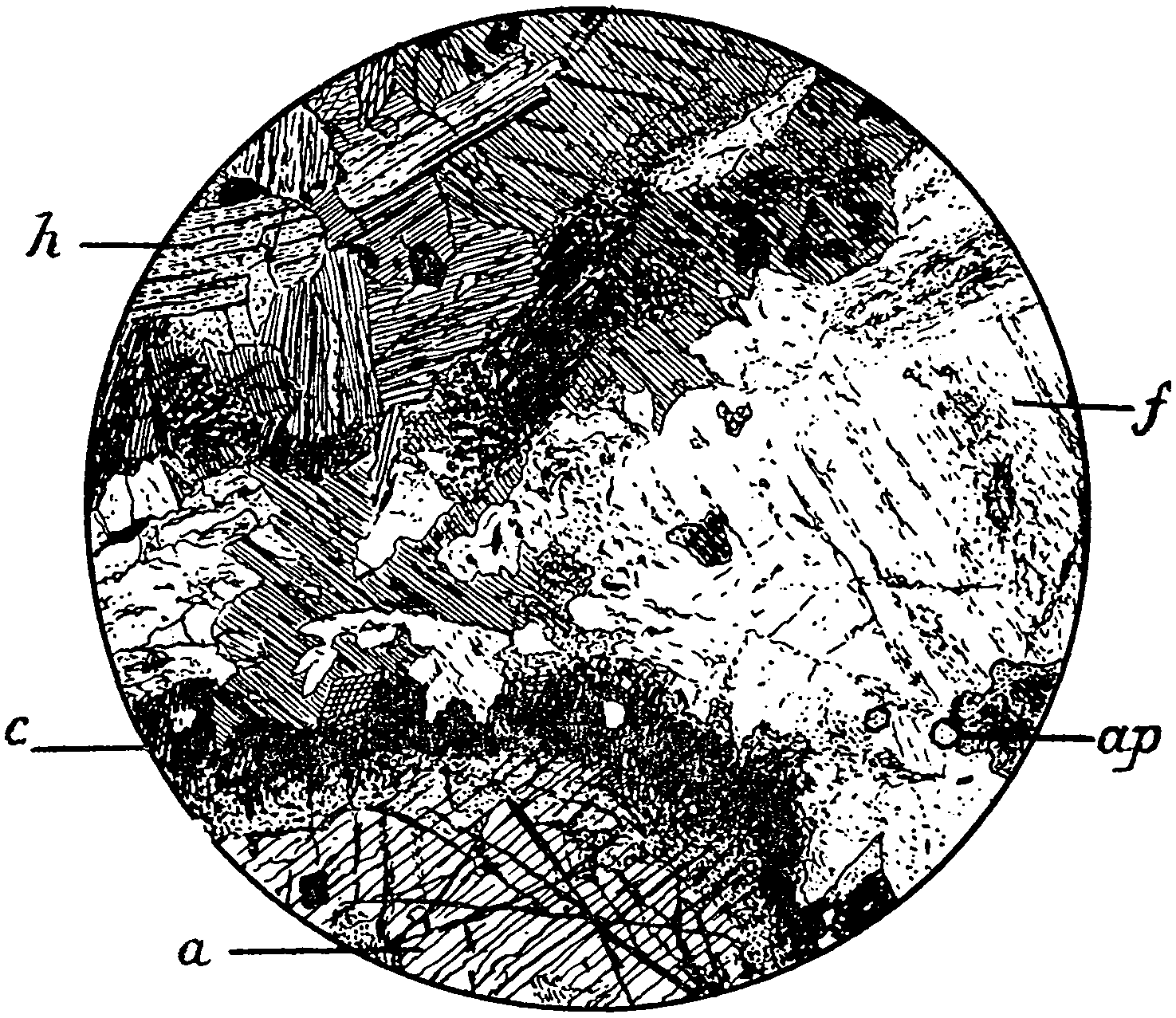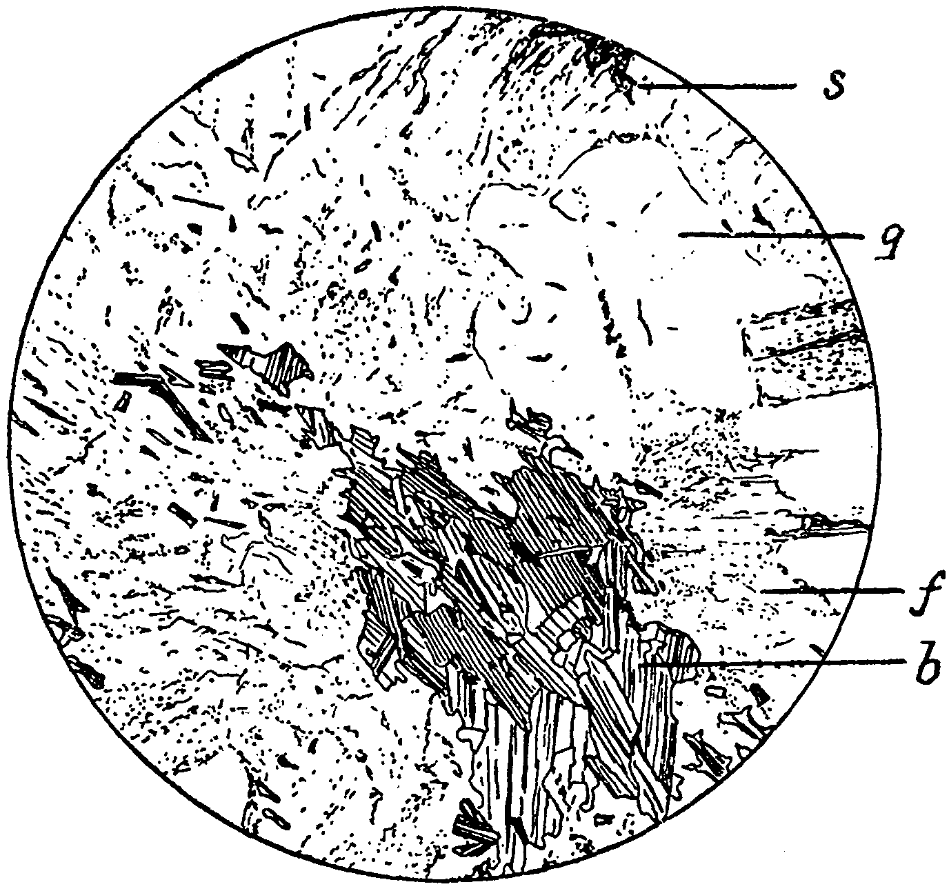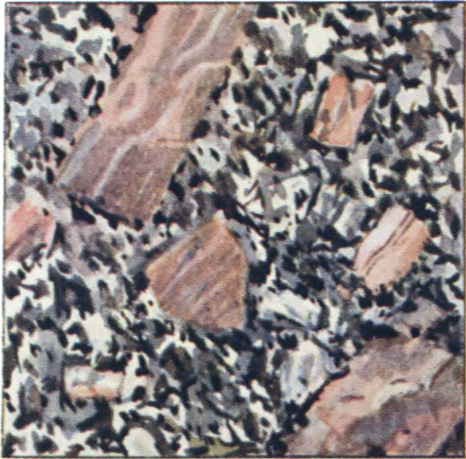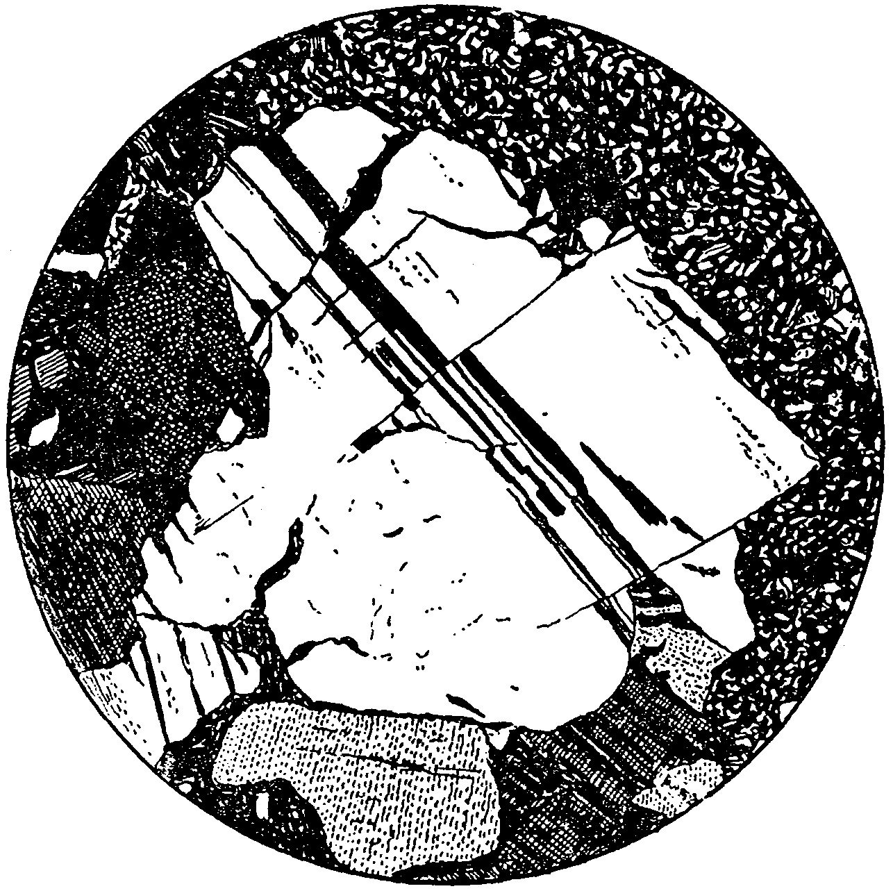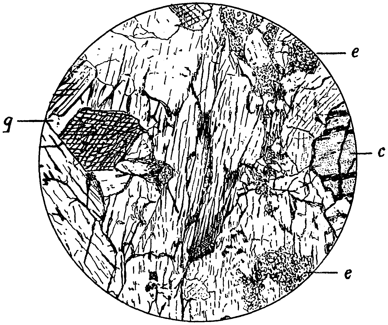 The plates illustrating the scenic types are from my own photographs, while those illustrating the natural-size aspect of the typical[vii] rocks are reproductions from water-colour drawings which I made from actual specimens. These coloured plates of rocks are mainly designed to enable prospectors to identify readily the ordinary kinds of stone they meet with in the field; but they will also serve to give to petrologists an idea of the appearance of hand specimens of rocks from this part of the world, which are not frequently met with in the great museums. The text figures of rock sections I have mostly drawn at the microscope on silver prints from photographic plates, the prints being afterwards bleached out with mercuric chloride; they will appear slightly diagrammatic in places, owing to the necessity of using lines and dots for tints, but I find I myself get a better idea of a rock from a drawing of this kind than from a photograph.