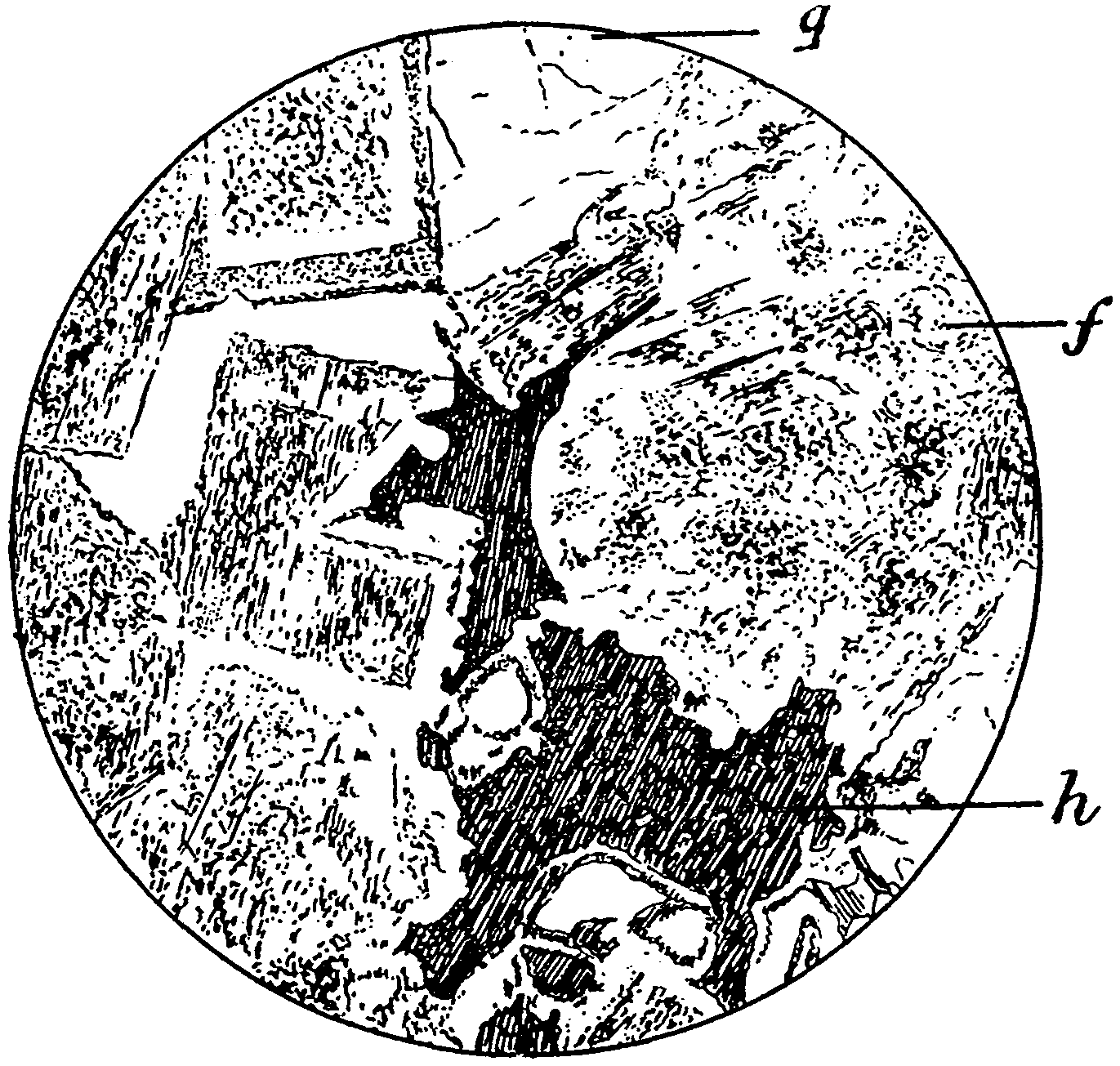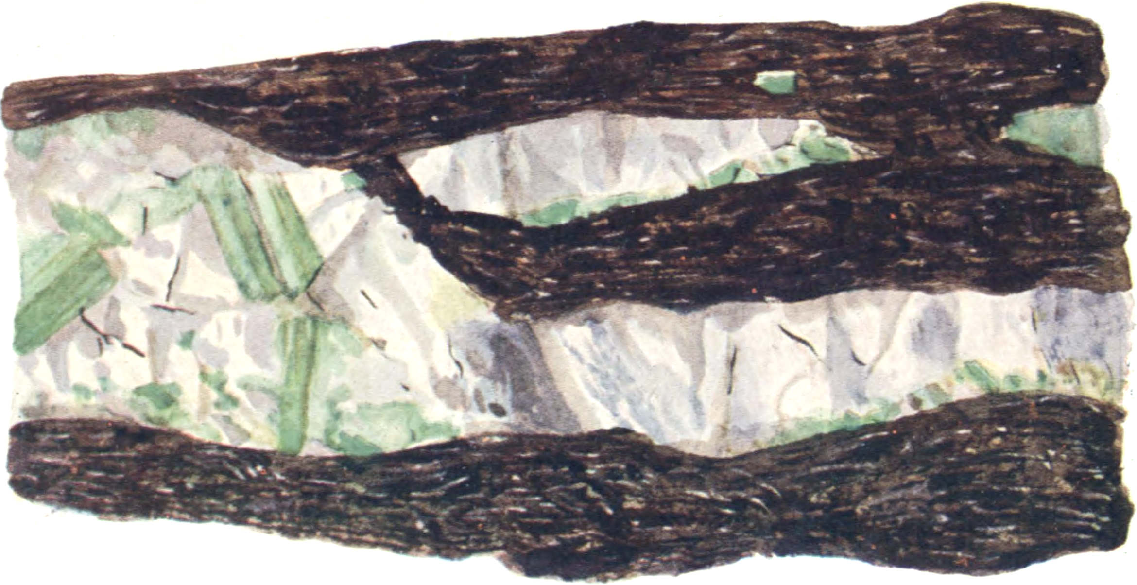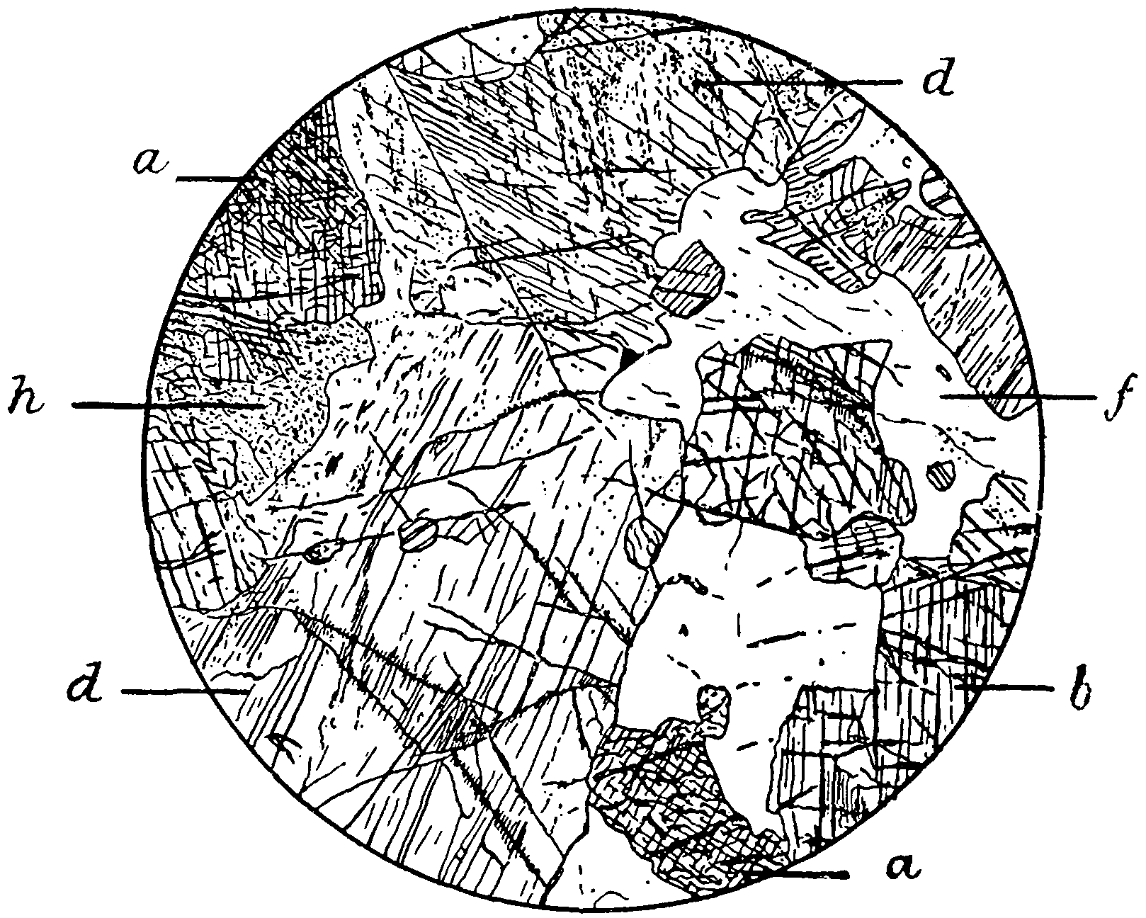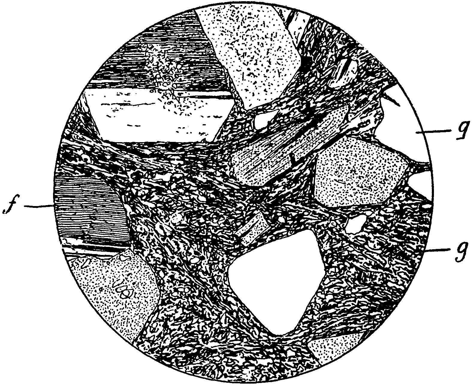 The plates illustrating the scenic types are from my own photographs, while those illustrating the natural-size aspect of the typical[vii] rocks are reproductions from water-colour drawings which I made from actual specimens. These coloured plates of rocks are mainly designed to enable prospectors to identify readily the ordinary kinds of stone they meet with in the field; but they will also serve to give to petrologists an idea of the appearance of hand specimens of rocks from this part of the world, which are not frequently met with in the great museums. The text figures of rock sections I have mostly drawn at the microscope on silver prints from photographic plates, the prints being afterwards bleached out with mercuric chloride; they will appear slightly diagrammatic in places, owing to the necessity of using lines and dots for tints, but I find I myself get a better idea of a rock from a drawing of this kind than from a photograph.