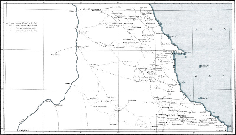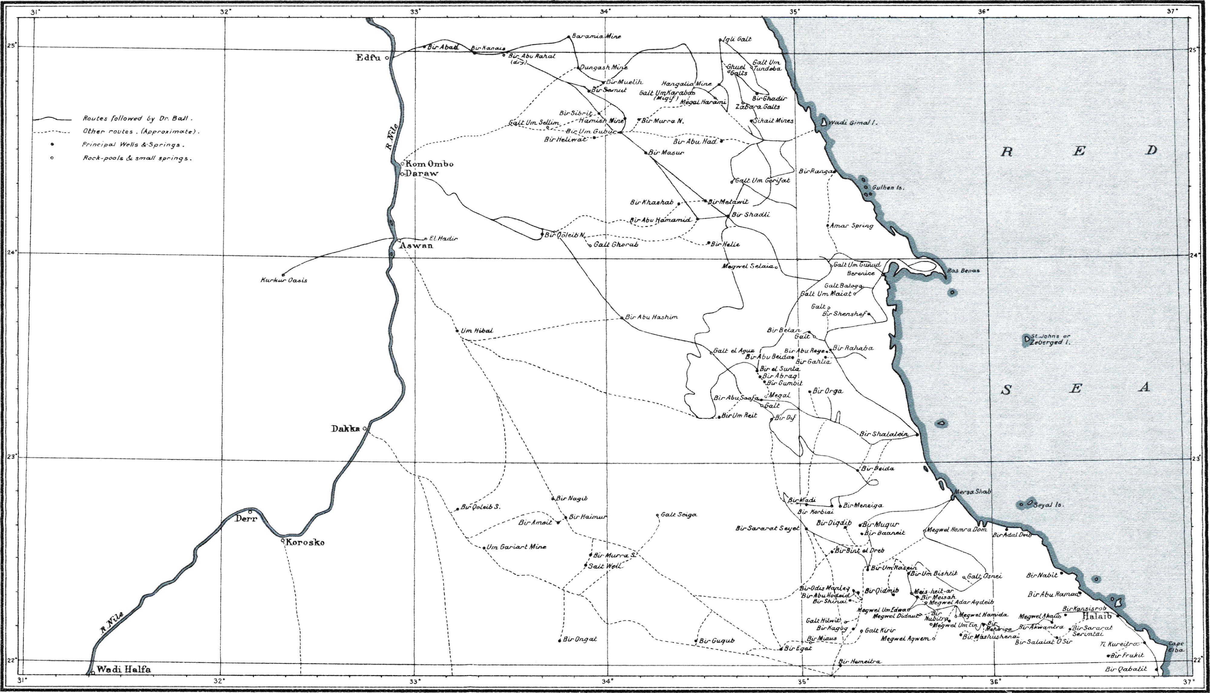 In regard to the cartographic material, most of which is new, special attention has been given to the place-names, and it is believed that these are correct in almost every case. But as the names are in languages not understood by European draughtsmen, it is almost impossible that mistakes have been entirely avoided; in any case where map and text may disagree in spelling (the differences will, I trust, never be so great as to leave doubts of identity), the text should be followed in preference to the map, as mistakes in the text are usually more easily perceived and corrected. I would remark that although the whole of the field maps have been employed in preparing the small scale ones, yet the full detail can be recorded only on the large scale maps, which are given for the most important districts; a future explorer would do well, therefore, to refer to the manuscript field maps which are filed at the Survey Office at Gîza, before concluding that no more detailed survey exists than is shown on the maps in this book.