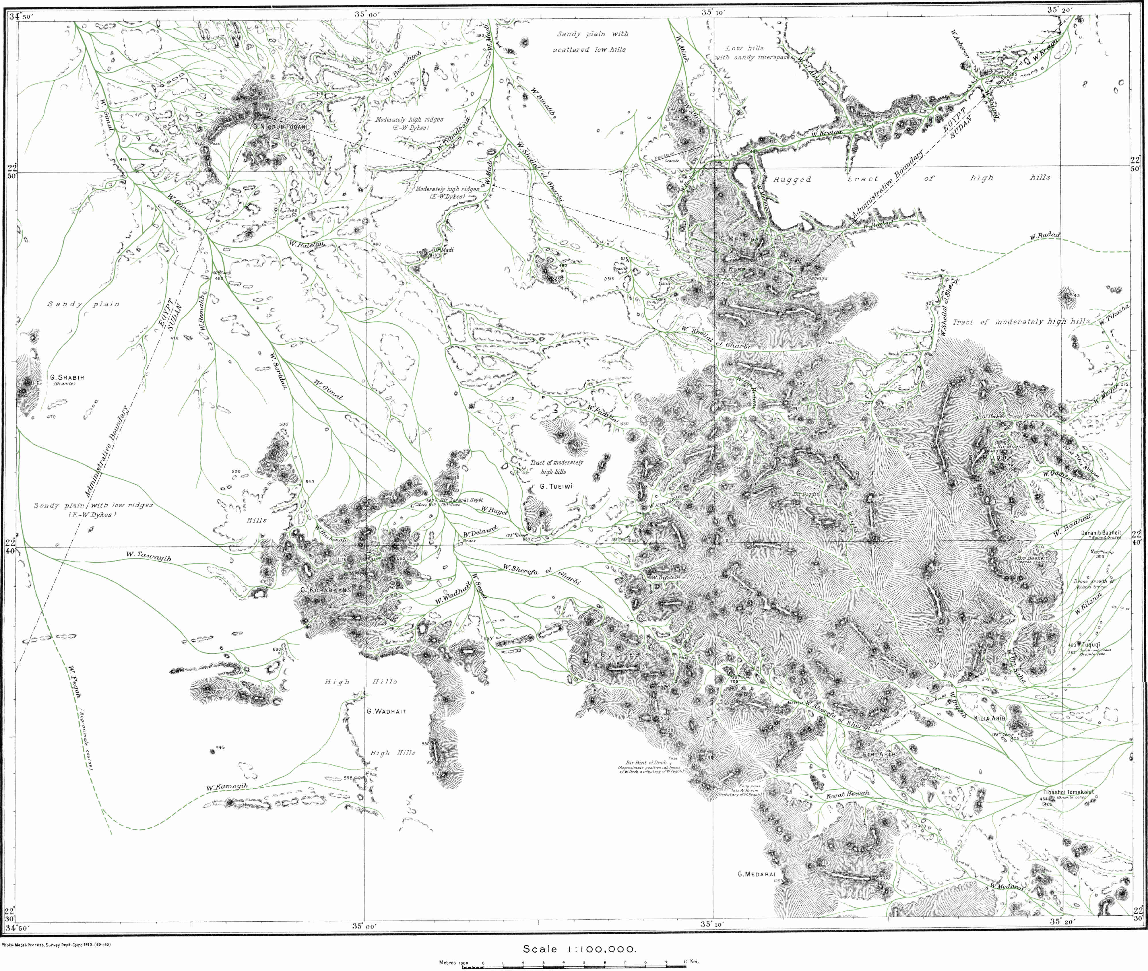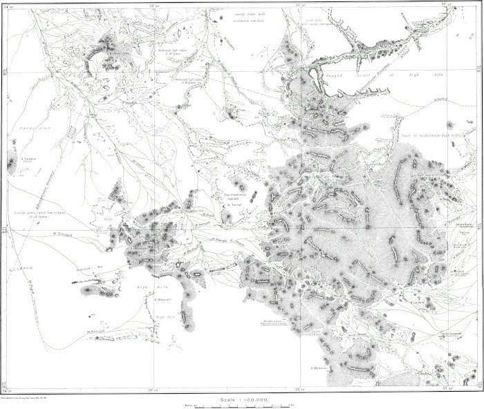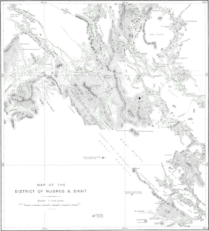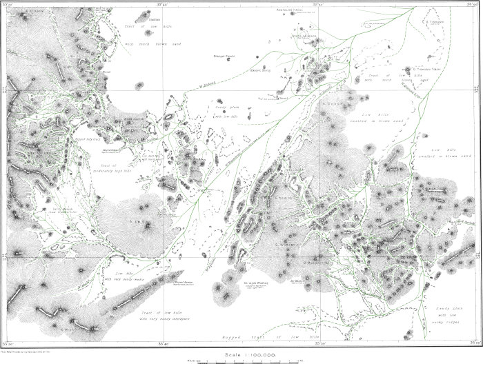 In the fourth to sixth chapters the drainage lines and hill features are systematically described. A knowledge of the drainage[vi] lines, as the key to a precise understanding of the relief, is nowhere more important than in these deserts.