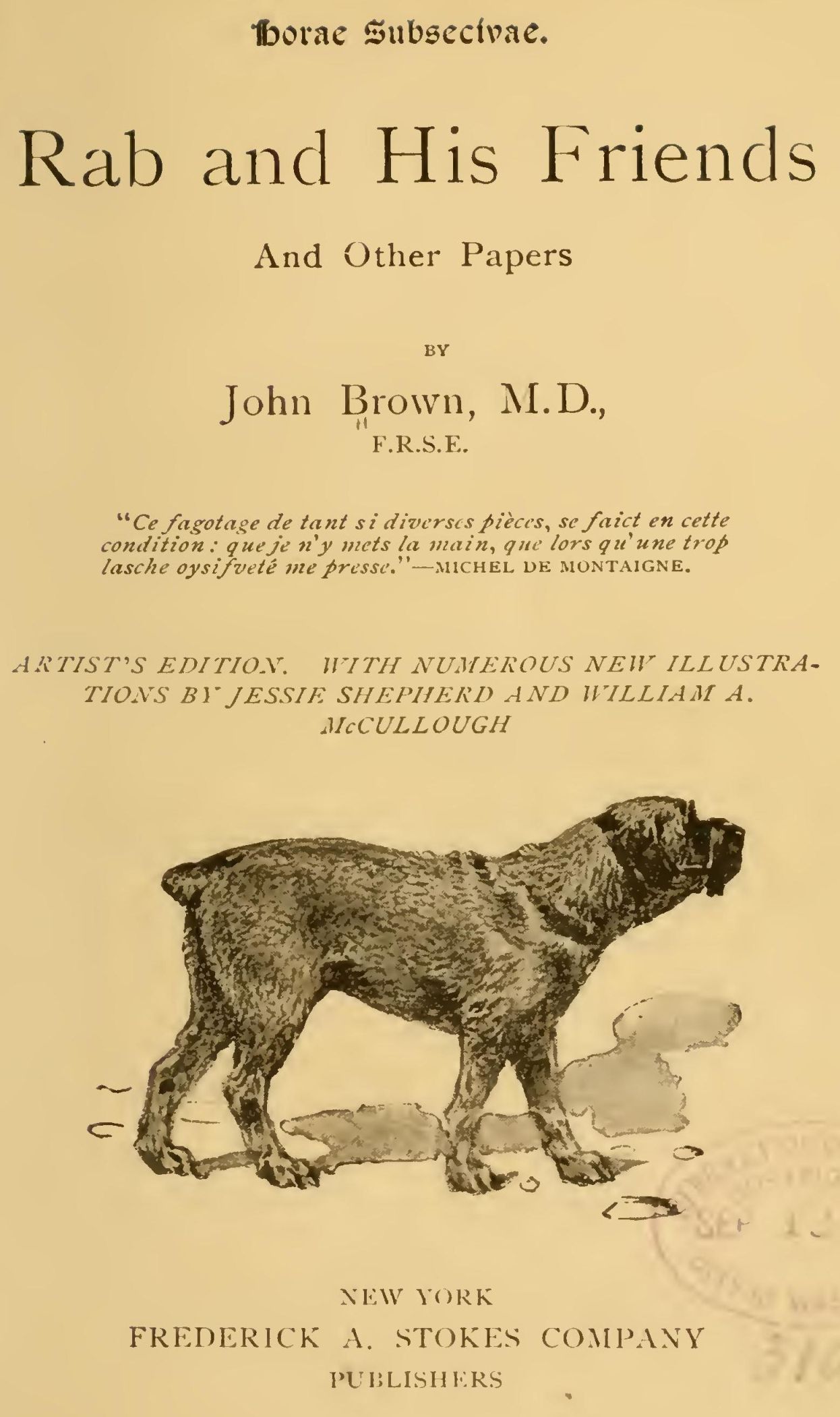 One fine October afternoon, I was leaving the hospital, when I saw the large gate open, and in walked Rab, with that great and easy saunter of his. He looked as if taking general possession of the place; like the Duke of Wellington entering a subdued city, satiated with victory and peace. After him came Jess, now white from age, with her cart; and in it a woman carefully wrapped up,—the carrier leading the horse anxiously, and looking back. When he saw me, James (for his name was James Noble) made a curt and grotesque "boo," and said, "Maister John, this is the mistress; she's got a trouble in her breest—some kind o' an income we're thinkin'."