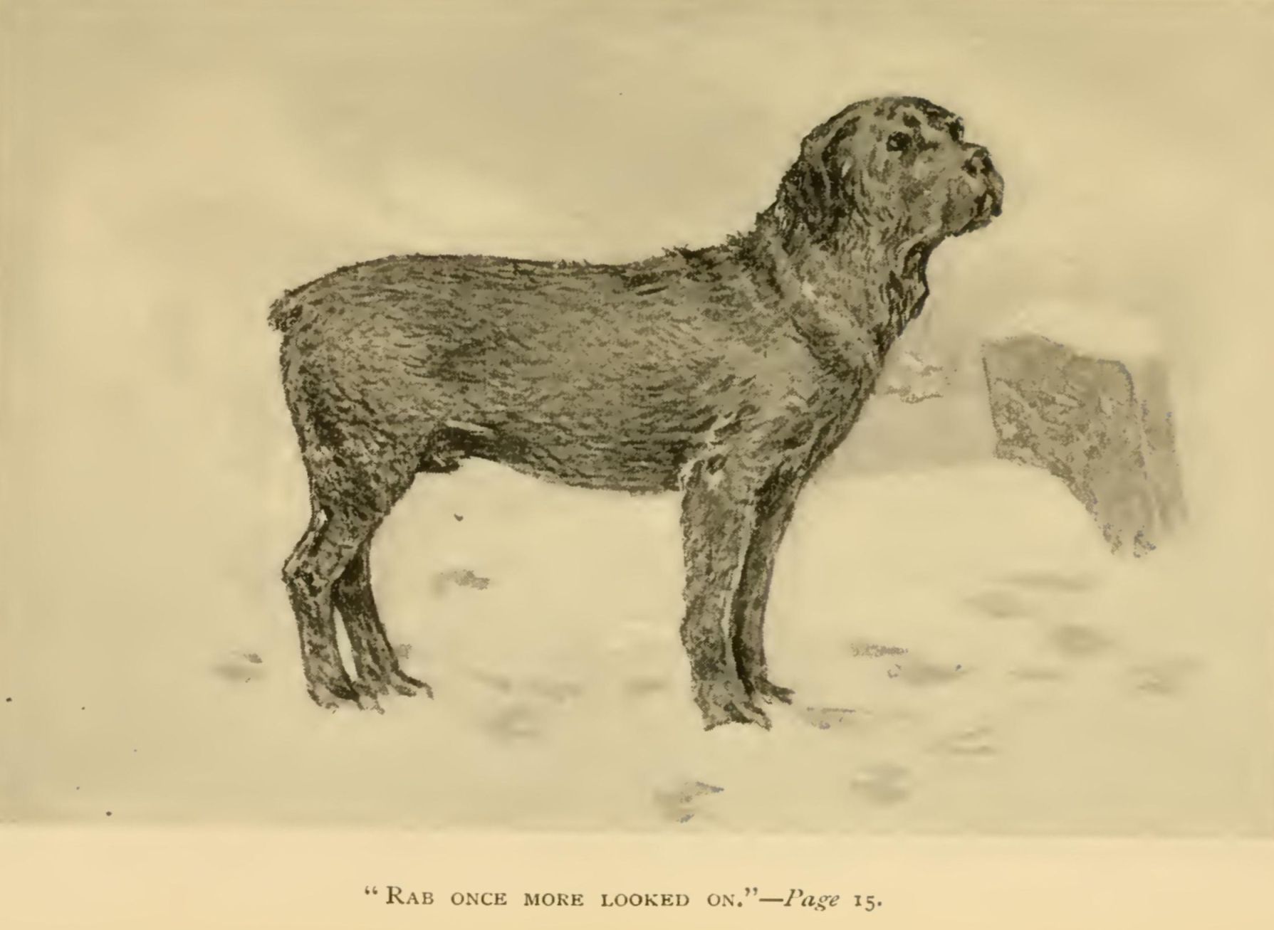 Rab I saw almost every week, on the Wednesday; and we had much pleasant intimacy. I found the way to his heart by frequent scratching of his huge head, and an occasional bone. When I did not notice him he would plant himself straight before me, and stand wagging that bud of a tail, and looking up, with his head a little to the one side. His master I occasionally saw; he used to call me "Maister John," but was laconic as any Spartan.