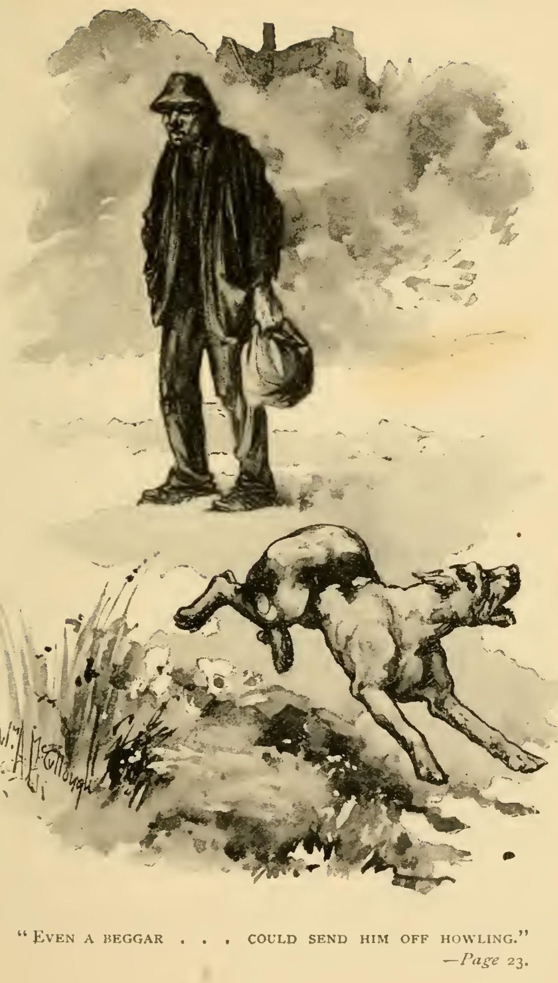 "I'se warrant he's do that, doctor," and in slunk the faithful beast. I wish you could have seen him. There are no such dogs now. He belonged to a lost tribe. As I have said, he was brindled, and grey like Rubislaw granite; his hair short, hard, and close, like a lion's; his body thickset, like a little bull—a sort of compressed Hercules of a dog. He must have been ninety pounds' weight, at the least; he had a large blunt head; his muzzle black as night, his mouth blacker than any night, a tooth or two—being all he had—gleaming out of his jaws of darkness. His head was scarred with the records of old wounds, a sort of series of fields of battle all over it; one eye out, one ear cropped as close as was Archbishop Leighton's father's; the remaining eye had the power of two; and above it, and in constant communication with it, was a tattered rag of an ear, which was for ever unfurling itself, like an old flag; and then that bud of a tail, about one inch long, if it could in any sense be said to be long, being as broad as long—the mobility, the instantaneousness of that bud were very funny and surprising, and its expressive twinklings and winkings, the intercommunications between the eye, the ear, and it, were of the oddest and swiftest.