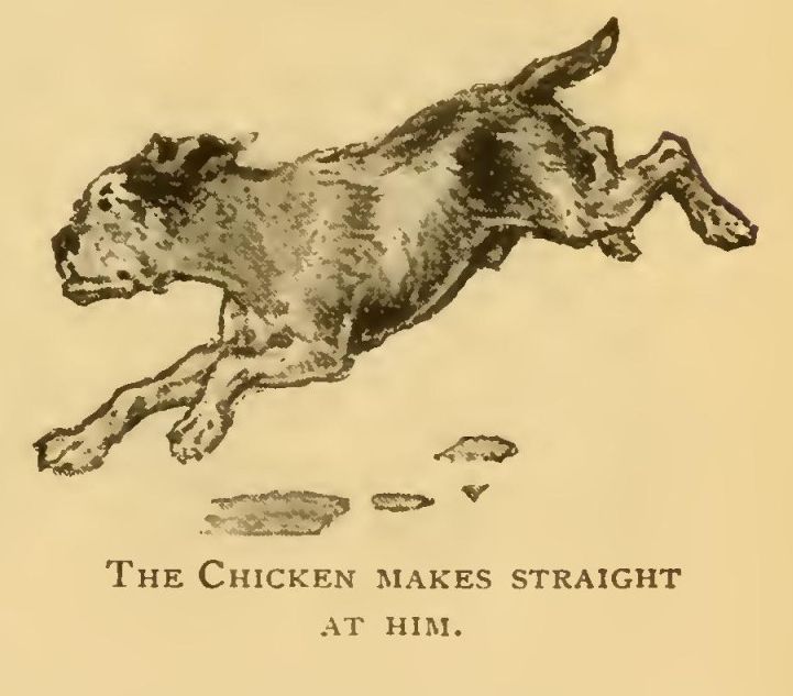 The Chicken makes straight at him, and fastens on his throat. To our astonishment, the great creature does nothing but stand still, hold himself up, and roar—yes, roar; a long, serious, remonstrative roar.