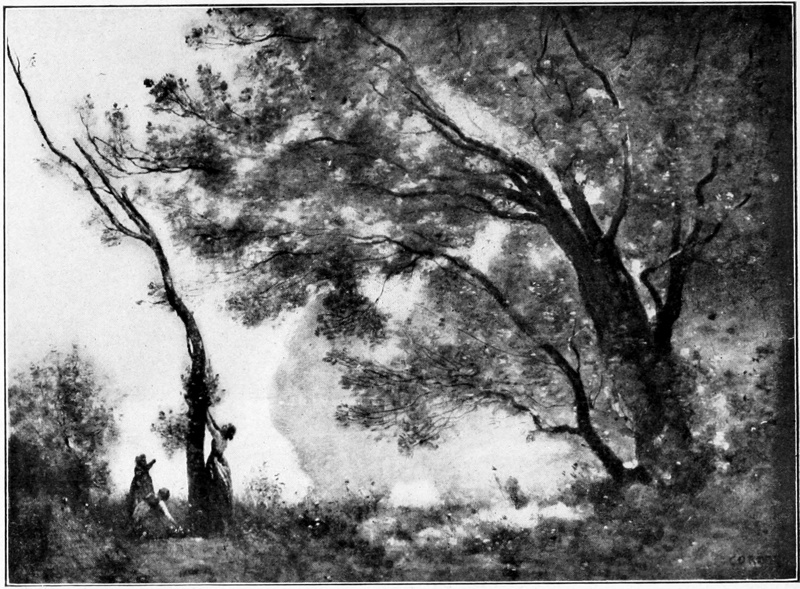 Please note the word “suggestion,” for it is by suggestion that the greatest truths of art are brought home to us. The realist, whom we have been hastily considering, does not care for this method of approach. He is bent upon realization. He is analytical in his statement of each and every fact and makes a full report. All painters do this in some degree during the early stages of their career, but as they advance in years and experience there is a tendency to a broader treatment, a return to the simple line of the child, to the synthesis of a Millet, as shown in the arms, hands, and backs of the women in “The Gleaners” (Plate 4), to the implication and suggestion of a Corot, as shown in the sky of the “Biblis.” Facts 23are summarized. A mere charcoal outline drawn by Degas gives us the reliefs, proportions, weight, and bulk of a human figure; a shadow with Giorgione or Rembrandt sums up the series of facts beneath it, and becomes suggestive by its very mystery and uncertainty; a blended blur of color by Whistler may bring to mind a heaving wave in mid-ocean better than all the drawn and tinted and “realized” waves of all the realists.