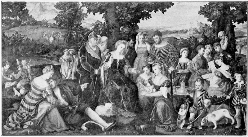 It is the Marcus Stones, the Viberts, and the Defreggers of painting who have brought the story into contempt and caused the opposition to it. That the “unco guid” Sunday-school incident or the horse-play of the grinning Tyrolean peasant, or the red-robed monk story should pass current as art while the 155peasants of Millet, the landscapes of Corot, the marines of Whistler should be sneered at as impressionistic or “faddish,” was more than the artistic brotherhood could bear. It took up the cudgels for more art and less literature, and in knocking the silly incident in the head, it also tried to knock in the head every other incident in the art-world. This was perhaps an error. For the subject is not necessarily silly except in the hands of the whipper-snapper painter. There is nothing silly about the “Moses saved from the Nile” (Plate 23) by Bonifazio, or the “Miracle of the Slave” (Plate 15) by Tintoretto, or the “Good Samaritan” by Rembrandt, or the “Garden of Love” by Rubens, or the “Shepherds in Arcadia” (Plate 30) by Poussin. Oh, yes; the old masters could paint stories when it pleased them to do so. They were religious and classic stories—themes hallowed by tradition—but not differing in other respects from the stories of to-day. They painted them well and with great decorative skill and therefore you never hear any painter decrying them; but, so far as their legitimacy or illegitimacy is concerned, they were not different from the “Love and Death” of Mr. Watts or the “Beguiling of Merlin” by Sir Edward Burne-Jones or the “Blind Fiddler” by Sir David Wilkie.
