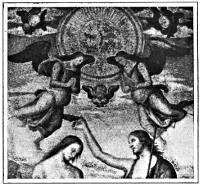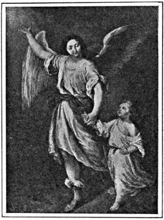 On the other hand, certain deeds to be done were given to certain angels who had definite names. These were the seven archangels. It was Michael, captain of the Hosts of Heaven, that overcame the Demon and drove him into the Bottomless Pit; it was Jophiel with the flaming sword that drove Adam and Eve out of Paradise; it was Zadkiel that stayed the hand of Abraham, and Chamuel that wrestled with Jacob. These were all archangels who appeared with their various symbols in Christian art. Uriel, guardian of the sun, is seen less[5] frequently than the others; but Raphael, the chief guardian angel, is often seen in company with Tobit, and occasionally in the pictures of the Last Judgment with Michael, blowing the dread blast of the great resurrection.
