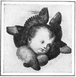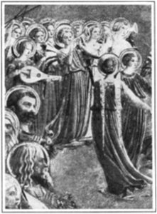 The angels that sang the Gloria in Excelsis, or knelt near at hand at the birth of Christ, were usually larger than the putti, girlish in form, and very beautiful of face.[4] They were dressed sometimes in colors, as with Correggio (kor-red´-jo); sometimes in gold brocades of gorgeous pattern, as with the Vivarini (vee-vahr-ee´-nee); sometimes in white and blue, as with Piero della Françesca (frahn-ches´-kah). Again, they frequently had jeweled crowns or embossed halos or peacock-eyed wings. It was the idea of the old masters to make them decoratively beautiful as well as representative of purity and truth. And they carried out this idea still further in the faces, which were always of the most lovely types they could find or imagine. To us today these angel faces are perhaps the most attractive feature of this early church art of Italy.