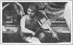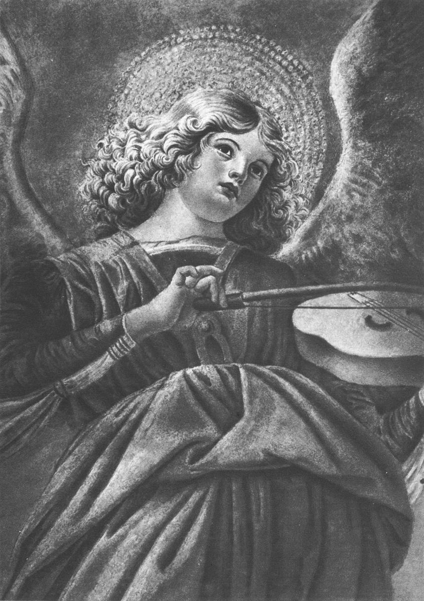 Of course the ideal of angelic beauty varied with each painter. Each chose for a model the fairest type he could find, and each differed from his fellow. Perhaps the most popular types of angels in the early Renaissance were painted by Melozzo da Forlì. A notable group of them was painted in a cupola of the Church of the Apostles in Rome. They were angels of the Ascension, and surrounded the rising figure of Christ. The fresco afterward became so damaged that it was taken down, and some of the angels were transferred to the Sacristy of St. Peter's, where they are now to be seen. Our reproduction shows a detail of one of them,—one with a fair face, abundant hair, a halo about the head made up of golden cubes of mosaic, and large expanded wings. The figure is seen[6] slightly foreshortened, and this, with the spread wings that seem really large enough to support an angel, gives the impression of flight, or at least a hovering movement. The wings are upraised, and seem to frame the beautiful head and its halo. This upward swing of the wings is counterbalanced by the downward sweep of the drapery from the waist line. Between the upward and the downward curves is a swirling cross line, made up by the shoulder, the arm, and the violin bow. All this is shrewdly worked out, and gives force and movement to the figure. The whole composition has nobility and loftiness about it, and is not a mere sweet-faced affair of the Carlo Dolci (dol´-chee) kind.
