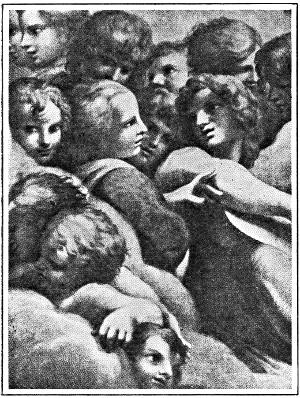 The red-robed angels (they were painted red of face as well as of robe) were the Seraphim, the angels of love, and nearest to God. Often with the early painters only their heads were shown, with wings crossed in front of them, sometimes with four, six, or eight wings. The blue-robed angels were the Cherubim, the angels of knowledge, and they too were shown in their heads only, with many crossed wings. They appeared in groups and halos surrounding the presence of the Father, the Son, or the Virgin. The cherubs or putti of later Italian art, so frequently seen with the Madonna and Child, are the artistic descendants of the Seraphim and Cherubim. They are seen in the large aureoles of light that surround the Madonna; for instance, in Raphael's "Sistine Madonna" and Titian's "Assumption of the Virgin." They recede into the background or come forward in clouds as the countless hosts of heaven.