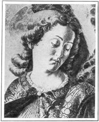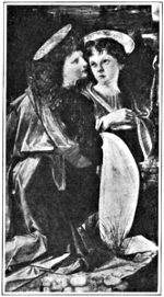 A historic and even a sentimental interest attaches to Leonardo da Vinci's (lay-o-nahrd´-o dah vin´-chee) little angel in the Baptism of Christ by Andrea Verocchio (vay-rok´-kee-o). Vasari (vah-sah´-ree) recites the story of how Verocchio, when ill perhaps, told his pupil, the young Leonardo, to finish this picture by painting in the second angel, and that Leonardo did it so well that it was superior to the other parts of the picture. "Perceiving this, Andrea resolved never again to take pencil in hand; since Leonardo, though still so young, had acquitted himself better in the art than he had done." This is a pretty story, which has been pooh-poohed and denied by recent criticism, but without reason. The angel with the profile was certainly done by a different hand than the angel with the full face. It is different from any other part of the picture, and there is every reason to believe it done by Leonardo as Vasari states. The charm of the angel, the type, the graceful contours, the light and shade, all foreshadow the later work of Leonardo. What a lovely creation, not only in face and feature, but in serenity and fine feeling!