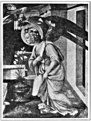 But the angel Gabriel appears in art oftener than all the other angels put together. This is because he was the angel of the Annunciation and foretold the coming of Christ. He is seen a thousand times in Italian art, lilies in hand, kneeling and repeating the message to the Madonna. The theme was the most popular of all, and a thousand different types of beauty were created to impersonate Gabriel. Many of them are still existent, and some of them are the most lovely creations of the old masters.