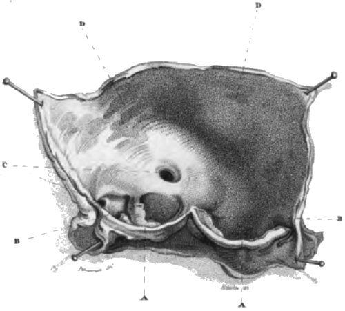 The pericardium contained little more than the usual quantity of water. The heart, which exhibited marks of some inflammation on its surface, was astonishingly large, and firm in proportion. Its cavities were principally filled with coagulum. The semilunar valves of the pulmonary artery had their bases slightly ossified, and the remaining part thickened. There were only two valves of the aorta, and these were disorganized by the deposition of ossific matter about their bases, and a fleshlike thickening of the other part[7]. The parietes of the heart, especially of the left ventricle, were greatly thickened, and somewhat ossified near the origin of the aorta.