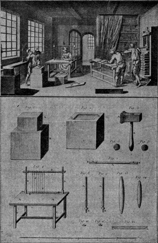 The picture opposite the title-page is a reprint of a page from the volume of plates, made in 1771, to illustrate Diderot’s Encyclopædia. This page is one of six, each 8×12 ins. in the original, illustrating the article in the encyclopædia on binding.