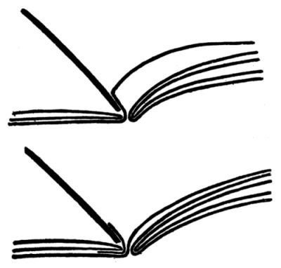I have refrained from going much into the details of the process of binding. The details can only be made clear by means of illustrations, and have already been most admirably set forth in Douglas Cockerell’s book. I have tried to draw attention to the important points. The librarian ought to know good results when he sees them, or at least when he tests them on his books; the details of every step he can learn if he will, by a little practice and[18] a good deal of observation. No librarian should try to bind or to conduct personally his own bindery. Binding is a special trade, and skill and speed in it come only by long practice. The librarian cannot become a skilled binder. He should become familiar with the results of the binding he gets by a study of his books. If he finds they do not wear well, but rot, break or show loose pages, let him keep a few statistics, and if he learns he is wasting money on cheap work or poor material, let him change his material and his processes, and perhaps his binder. I hope this book may lead some to test the work they are now getting, and may help some to get more satisfactory workmanship and more enduring materials. It is not a guide to the craft of binding. To get good binding, go to a good binder; to learn about the binding craft, practice it and read Cockerell; to discover if your binding is good, watch it and gather statistics of its wear.