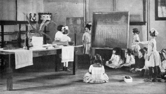 While all schools realize the importance of healthy pupils, the possibilities of using the activities of the child that are employed in giving him a strong healthy body, for general educational purposes, are not so well understood. As yet it is the pioneer in education who realizes the extent to which young children learn through the use of their bodies, and the impossibility291 of insuring general intelligence through a system which does not use the body to teach the mind and the mind to teach the body. This is simply a restatement of Rousseau’s proposition that the education of the young child rests largely on whether he is allowed to “develop naturally” or not. It has already been pointed out to what an extent Mrs. Johnson depends on the physical growth of her pupils as a tool for developing their intellectual ability, as well as the important part that muscular skill plays in the educational system of Madame Montessori. This seems not only reasonable but necessary when we think of the mere amount of movement, handling, and feeling of things that a baby must indulge in to understand the most familiar objects in its environment, and remember that the child and the adult learn with the same mental machinery as the very small child. There is no difference in the way the organism works after it is able to talk and walk; the difference lies in the greater complexity of activities which is made possible by the preliminary exercises. Modern psychology has pointed out the fact that the native instincts of a human being are his tools for learning. Instincts all express themselves through the body; therefore education which292 stifles bodily activities, stifles instincts, and so prevents the natural method of learning. To the extent of making an educational application of this fact, all the schools described are using the physical activities of their pupils, and so the means of their physical development, as instruments for training powers of judgment and right thinking. That is to say the pupils are learning by doing. Aside from the psychological reasons for teaching by this method, it is the logical consequence of a realization of the importance of the physical welfare of the child, and necessarily brings changes in the material of the schoolroom.