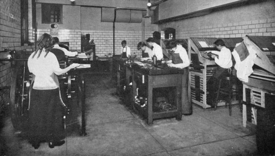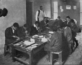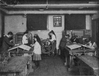From the seventh grade the pupils are the responsible workers in all the shops. A pupil who knows that he has to leave school when he262 has finished the eighth grade can now begin to specialize in the workrooms of some one department. If he wishes to become a printer he can work on the school presses for an entire year, or he can put in all his shop time in the bookkeeping department if he is attracted by office work. The girls begin to take charge of the lunch room, doing all the marketing and planning for the menus and keeping the books. Sewing work takes in more and more of the complications of the industry. The girls learn pattern drawing and designing, and may take a millinery course. The work for the students in office work is now extended to include stenography and typewriting and business methods. The art work also broadens to take in designing and hand metal work. There is no break between the work of the grades and the high school in the vocational department, except that as the pupil grows older he naturally tends to specialize toward what is to be his life work. The vocational department is on exactly the same level as the academic, and the school takes the wholesome attitude that the boy who intends to be a carpenter or painter needs to stay in school just as many years as the boy who is going to college. The result is the very high per cent. of pupils who go on to higher schools.