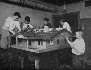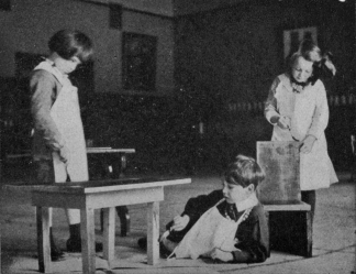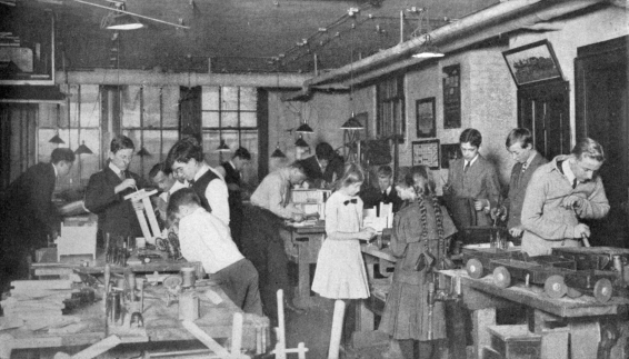 The first three grades spend one hour a day in manual training and drawing, which take the form of simple hand-work and are not done in the shops, but in an especially equipped room with a trained teacher. The pupils draw, do painting and clay modeling, sewing and simple carpentry work. The five higher grades spend twice as much time on manual training and drawing. The little children go into the shops255 as helpers and watchers, much as they go into the science laboratories, and they pick up almost as much theory and understanding of processes as the older children possess. The art work and simpler forms of hand-work are kept up for the definite training in control and technique that comes from carrying through a problem independently. Because the small child’s love of creating is very great, they continue until the pupils are old enough to choose what shop they will go into as apprentices to the teacher. Since sixth grade children are old enough and strong enough to begin doing the actual work of repairing and maintaining the building, in this grade they cease to be watchers and helpers and become real workers. Distributing school supplies, keeping the school records and taking care of the grounds are done by the pupils under the direction of the school office or the botanical laboratory, and constitute a course in shop work just as much as does painting or repairing the electric lights. The school heat and power plant is also a laboratory for the pupils, in which they learn the principles of heating and lighting in a thoroughly practical way because they do much of the work connected with keeping the plant running.