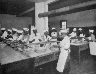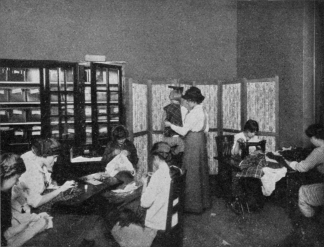 The girls’ technical high school does about what the vocational grammar schools are doing excepting that the work is more thorough, so that the graduate is more nearly prepared to take up work in some one industry. The cooking includes work in the school lunch room, and training in marketing, kitchen gardening and general housekeeping. The vocational classes proper take up large-quantity cooking, household administration, and restaurant management. In sewing the girls learn how to make their own clothes, but they learn as the work would have to be learned in a good dressmaking establishment; there is a course in machine operating for the girls who wish it. More advanced274 work teaches such principles of pattern making and designing as would be needed by a shop manager. But the most important difference is found in the emphasis that is put on the artistic side of women’s traditional occupations. Drawing is taught while the girls are learning to design dresses, and color in the same way; how to make the home pleasing to the eye is made a vital problem in the housekeeping department, and the art department has decorated the model rooms. The pattern and coloring for any piece of work, whether it is a centerpiece to be embroidered, a dress, a piece of pottery, or weaving, has been carefully worked out in the art department by the worker herself before she begins upon it in the shop. The girls are not simply learning how to do the drudgery of housework more efficiently; they are learning how to lift it above drudgery by making it into a profession.