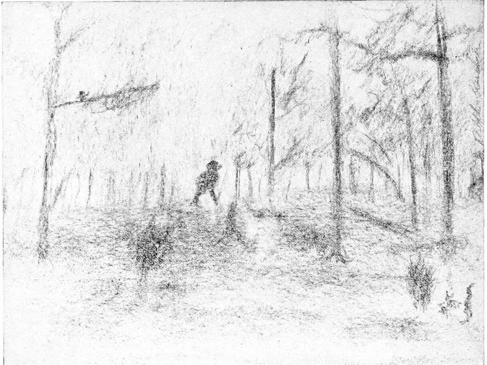 Finally he drew again from combined observation, memory, and imagination. He made again a free illustration, expressing his own imaginative thought, but controlled by detailed study of actual trees. The result was a scene representing a bit of forest; so far as it goes, it seems to me to have as much poetic feeling as the work of an adult, while at the same time its trees are, in their proportions, possible ones, not mere symbols.