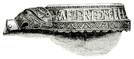 Some allusion to the vision of St. Cuthbert above-mentioned is supposed to have been intended by a little curious amulet of enamel and gold, richly ornamented, that was found in 1693 in Newton Park, at some distance northward from the abbey. On one side of it is a rude figure of a person sitting crowned, and holding in each hand a sceptre surmounted by a lily, which Dr. Hickes and other antiquaries have imagined to be designed for St. Cuthbert. The other side is filled by a large flower, and round the edge is the following legend: AELFRED MEC HEIT GEVVRCAN; that is, Alfred ordered me to be made. This piece of antiquity is now in the museum at Oxford, accompanied with the accounts of doctors Hickes and Musgrave, and the following memorandum: “Nov. 16, 1718, Tho. Palmer, esq; of Fairfield in Somersetshire, put this ancient picture of St. Cuthbert, made by order of king Alfred, into my hands to bee conveyed to yr Bodlean Library in Oxford, where his father Nat. Palmer, esq; lately dead, desired it might be placed and preserved.