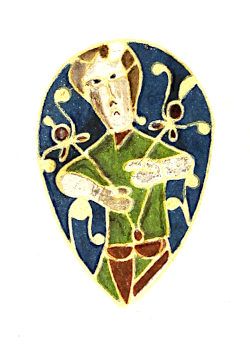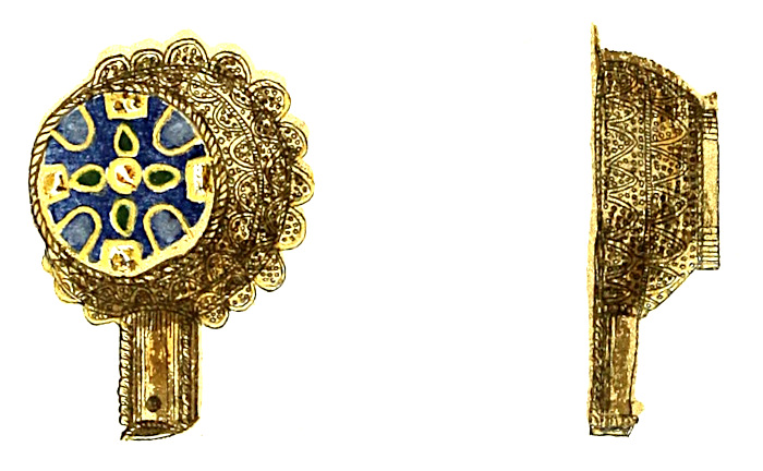 The cloisons of neither the eagle nor the Roach Smith ouche are as narrow as those employed by the Byzantine enamellers, although they are at most only half the width of those made use of in the Alfred Jewel. The doubling of the cloisons into loops, not commonly seen in Byzantine work but remarkable in the Jewel, is also noticeable in the eagle. Amongst the five colours employed in the eagle are the dark, translucent green, and the yellow, considered by Mr. Gardner as characteristic of Celtic-Saxon enamels, and also the opaque white such as is used for the flesh tint in the Jewel and the ouche, and, as Labarte particularly remarks, in the closely analogous heads upon the altar of Saint Ambrose.