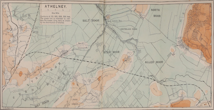 The map of Athelney and the lands adjacent is very ingeniously devised for exhibiting the contrast between the low level of the moorland and the contours of the rising country around; it is expressive and intelligible at a glance: and for this excellent illustration my acknowledgements are due to Mr. Bernhard V. Darbishire.