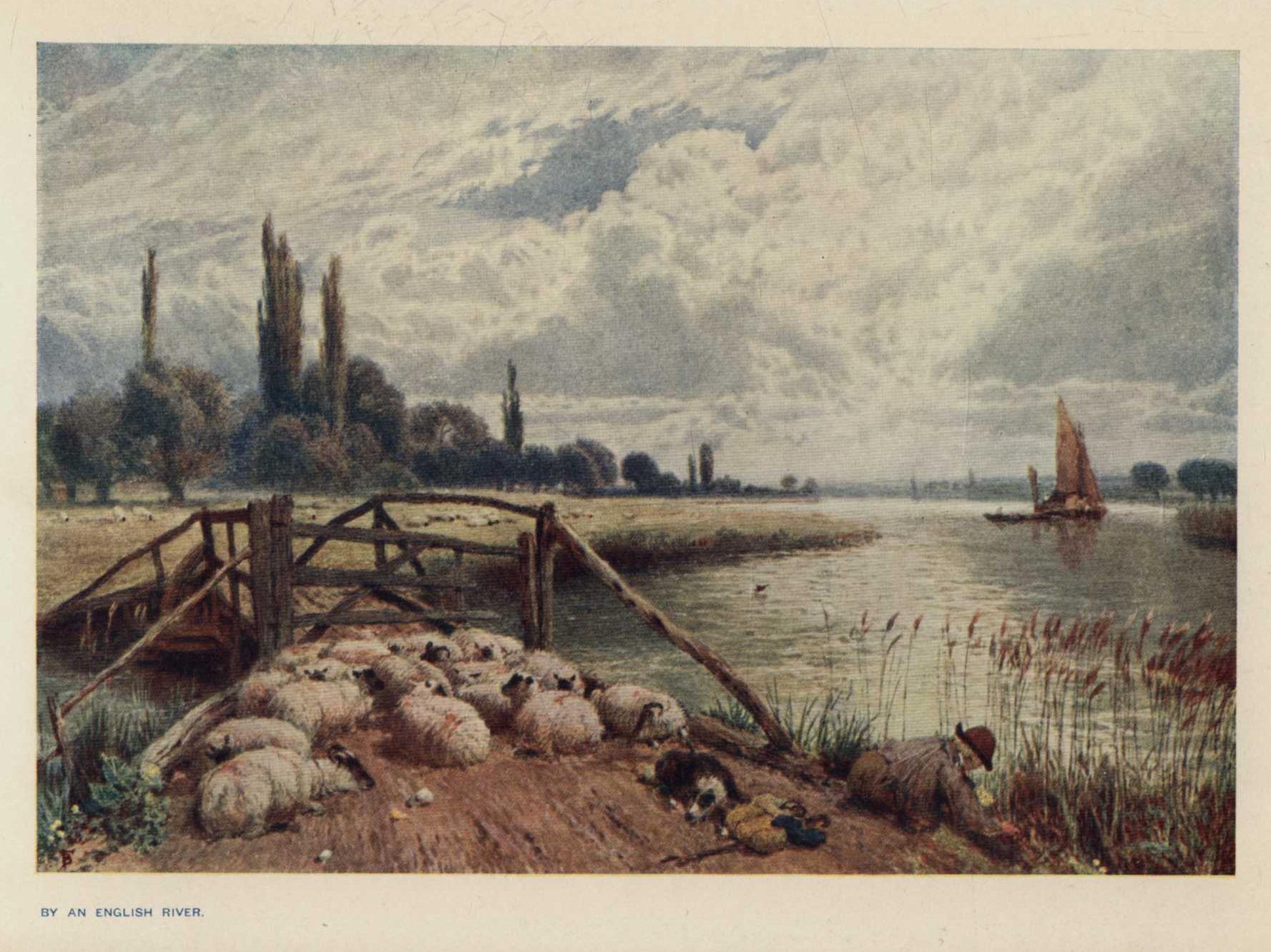 Below Oxford the river runs quietly along between rich meadows which in spring and early summer are carpeted with lovely wild-flowers, past quaint old houses and riverside inns, under straggling and picturesque old bridges, and ripples over fords where heavy cart-horses splash knee-deep through the clear shining stream. Here and there are pleasant villages on the bank, each with its old church, whose graveyard is shaded by great yews and entered by a quaint lych-gate.