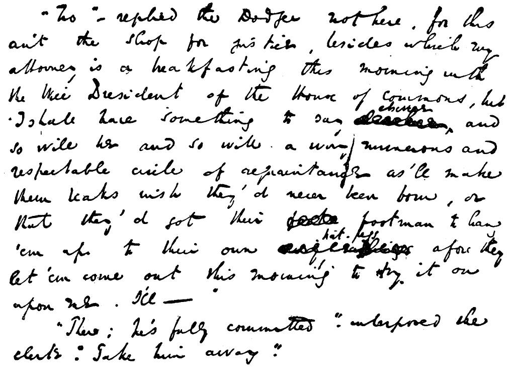 [270] There was no Chapter xx. as now; but the sentence which opens it ("For eleven years" in the original, altered to "eight years") followed the paragraph about his business partnership with Herbert, and led to Biddy's question whether he is sure he does not fret for Estella ("I am sure and certain, Biddy" as originally written, altered to "O no—I think not, Biddy"): from which point here was the close. "It was two years more, before I saw herself. I had heard of her as leading a most unhappy life, and as being separated from her husband who had used her with great cruelty, and who had become quite renowned as a compound of pride, brutality, and meanness. I had heard of the death of her husband (from an accident consequent on ill-treating a horse), and of her being married again to a Shropshire doctor, who, against his interest, had once very manfully interposed, on an occasion when he was in professional attendance on Mr. Drummle, and had witnessed some outrageous treatment of her. I had heard that the Shropshire doctor was not rich, and that they lived on her own personal fortune. I was in England again—in London, and walking along Piccadilly with little Pip—when a servant came running after me to ask would I step back to a lady in a carriage who wished to speak to me. It was a little pony carriage, which the lady was driving; and the lady and I looked sadly enough on one another. 'I am greatly changed, I know; but I thought you would like to shake hands with Estella too, Pip. Lift up that pretty child and let me kiss it!' (She supposed the child, I think, to be my child.) I was very glad afterwards to have had the interview; for, in her face and in her voice, and in her touch, she gave me the assurance, that suffering had been stronger than Miss Havisham's teaching, and had given her a heart to understand what my heart used to be."